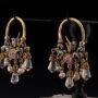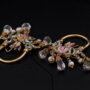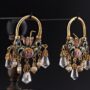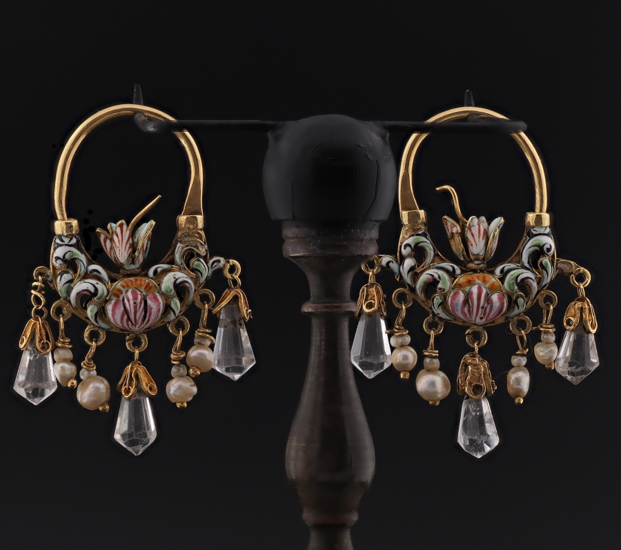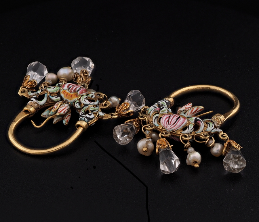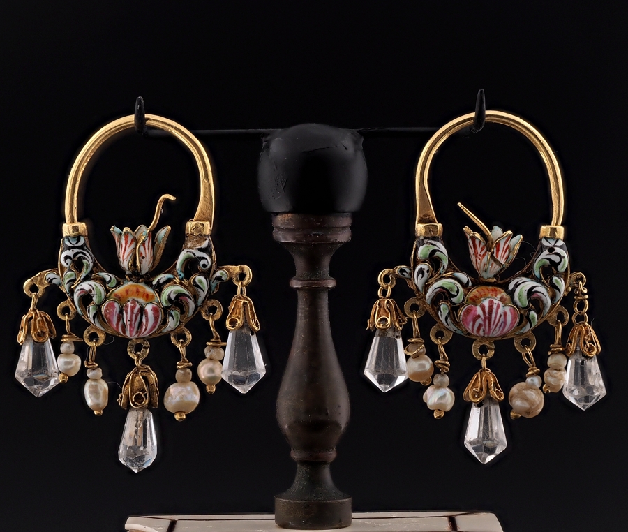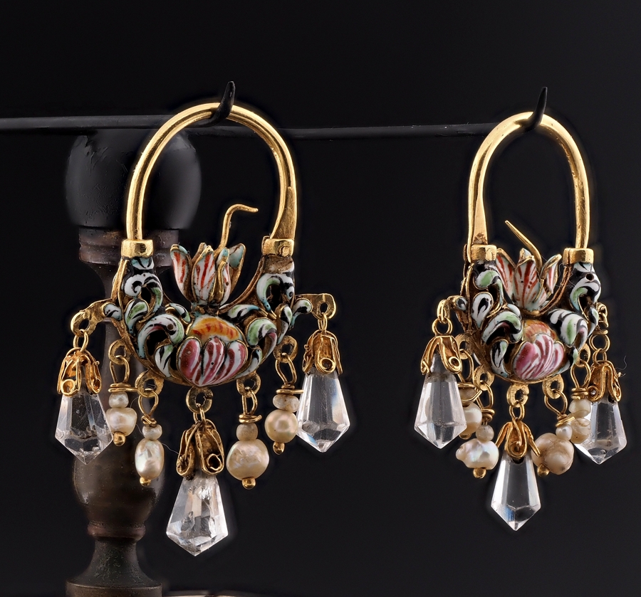 Large sized earrings of high carat gold, decorated throughout with skilful enamelling work resembling beautiful Pansy flowers in white and pink enamelling,green and black resembling rich foliate work, suspending Rock Crystal and natural Pearls