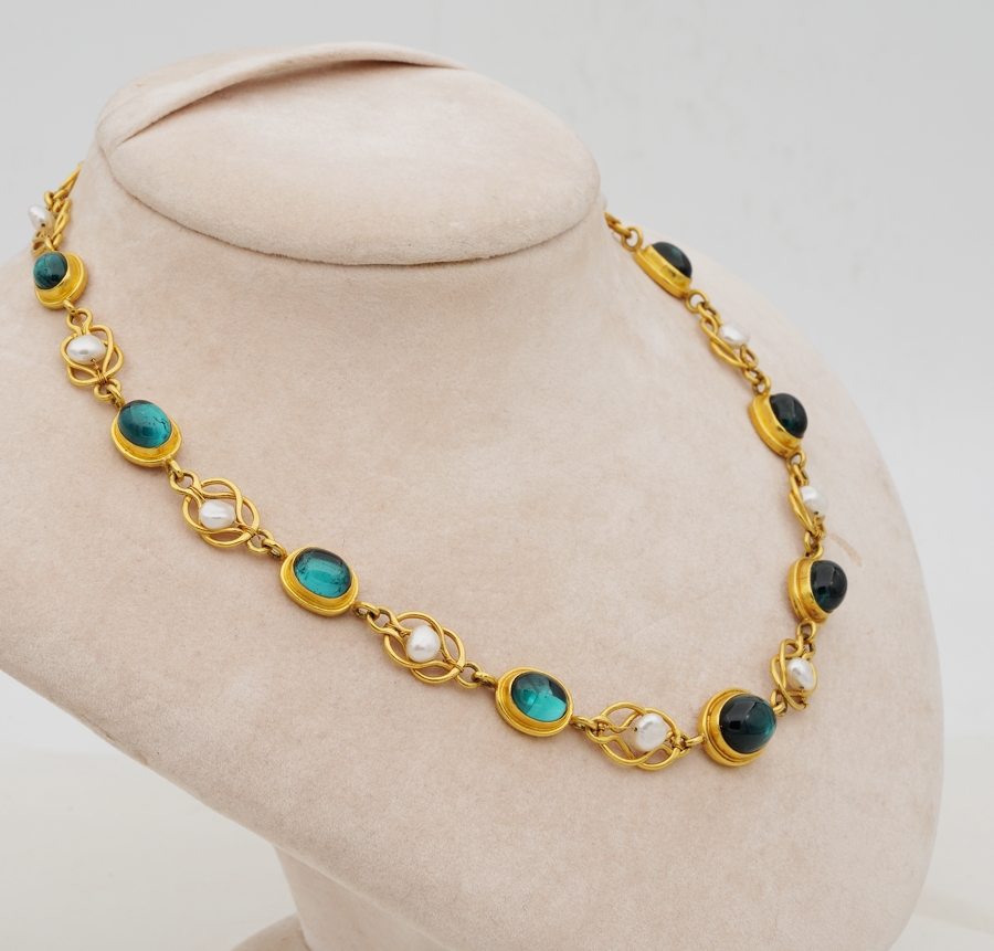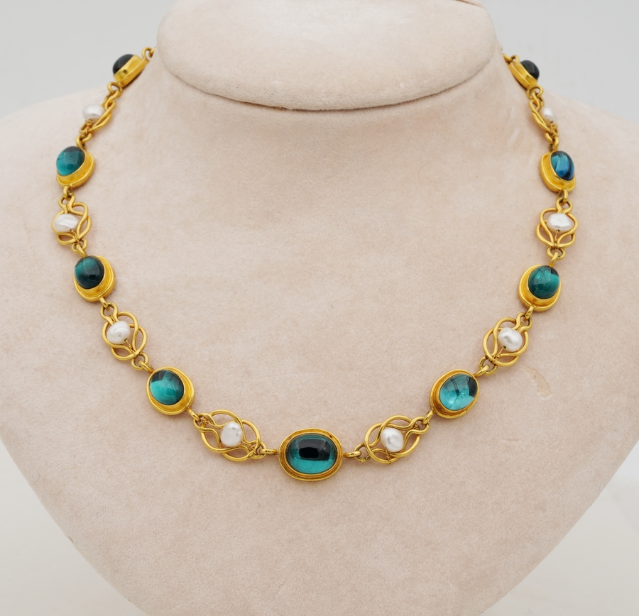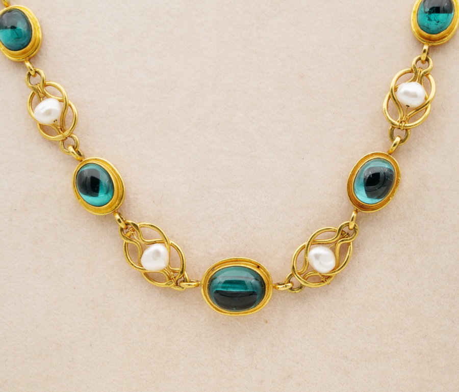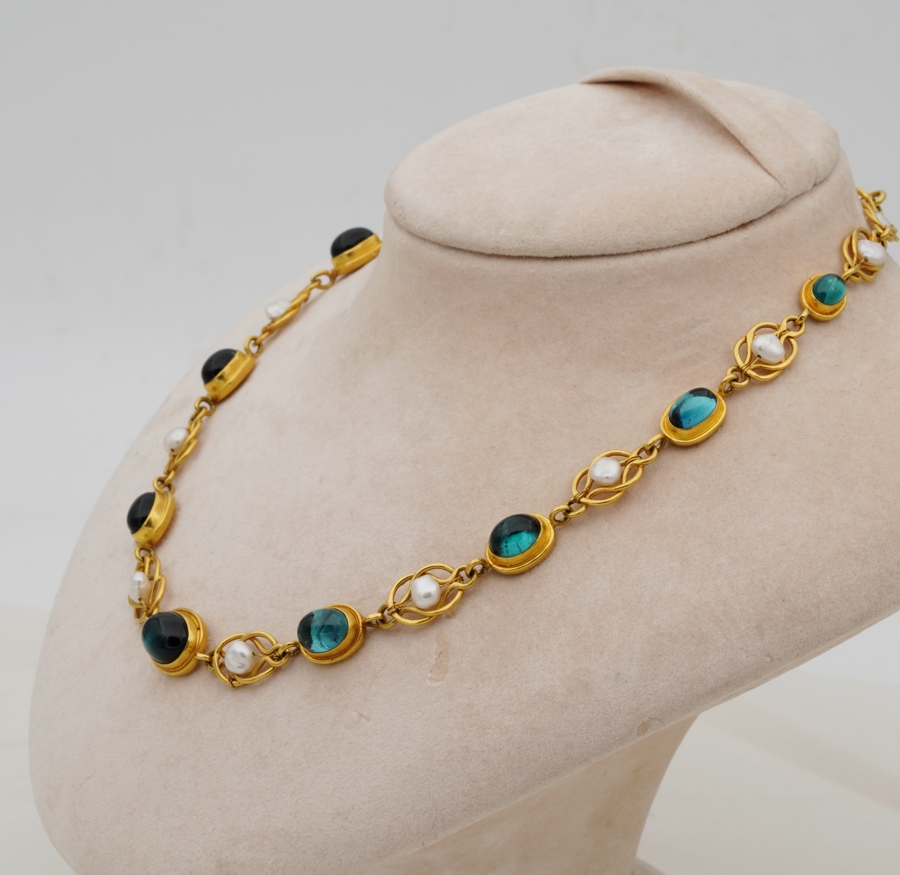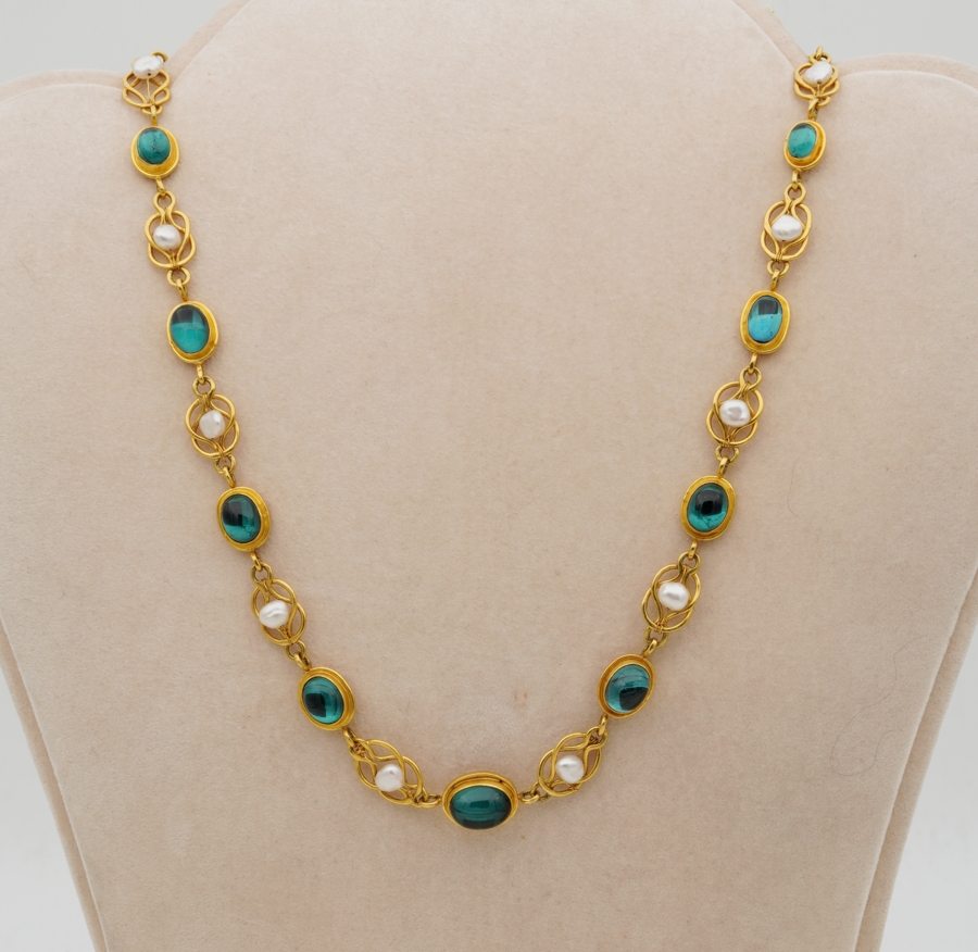 The necklace consists in a full set selection of oval natural untreated Tourmaline cabochon nestled onto gold rub mount ā close back set, alternated by gold knots embellished by natural pearls, wrapping around the neckline to a full turn of earth mined gemstones with the allure of gold and pearl