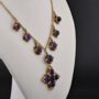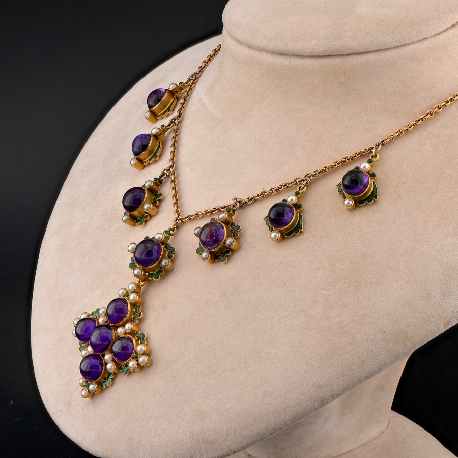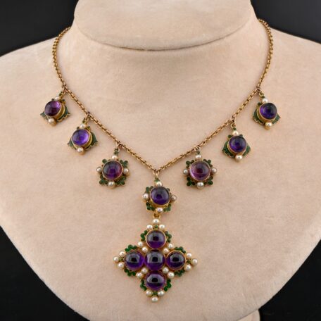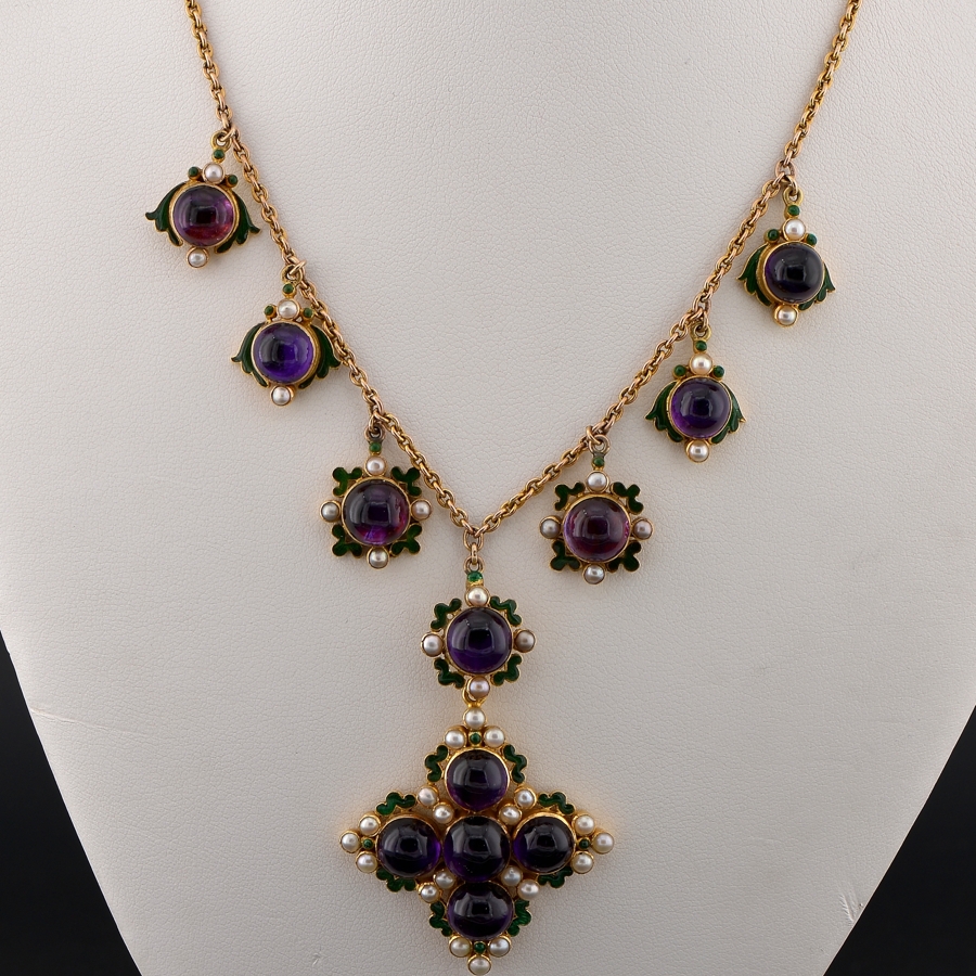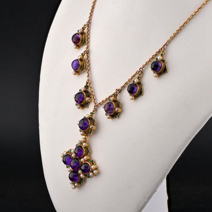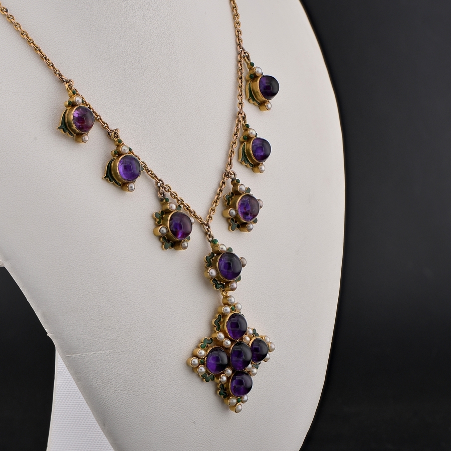 Hand made in solid 18 Kt gold, comprising a trace chain suspending Seven drops of gorgeous design set with natural Amethyst cabochons foiled back, natural baby Pearls enriched by Emerald Green enameling, detachable cross pendant made in the same manner is suspended as finial making it even more special