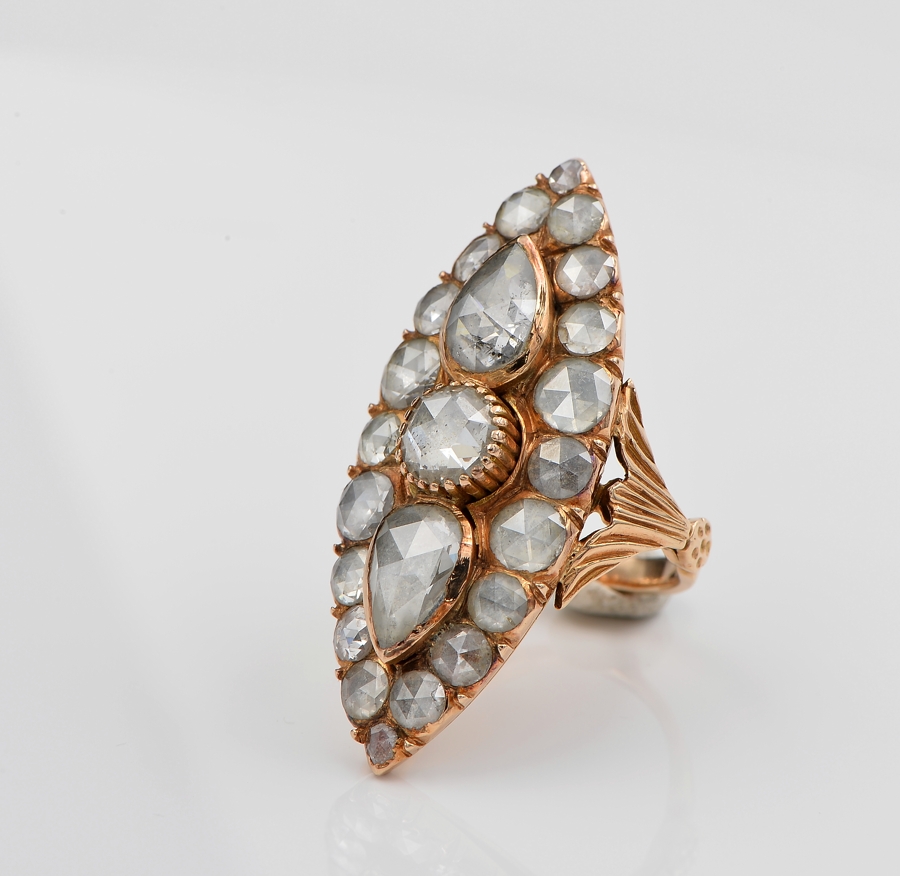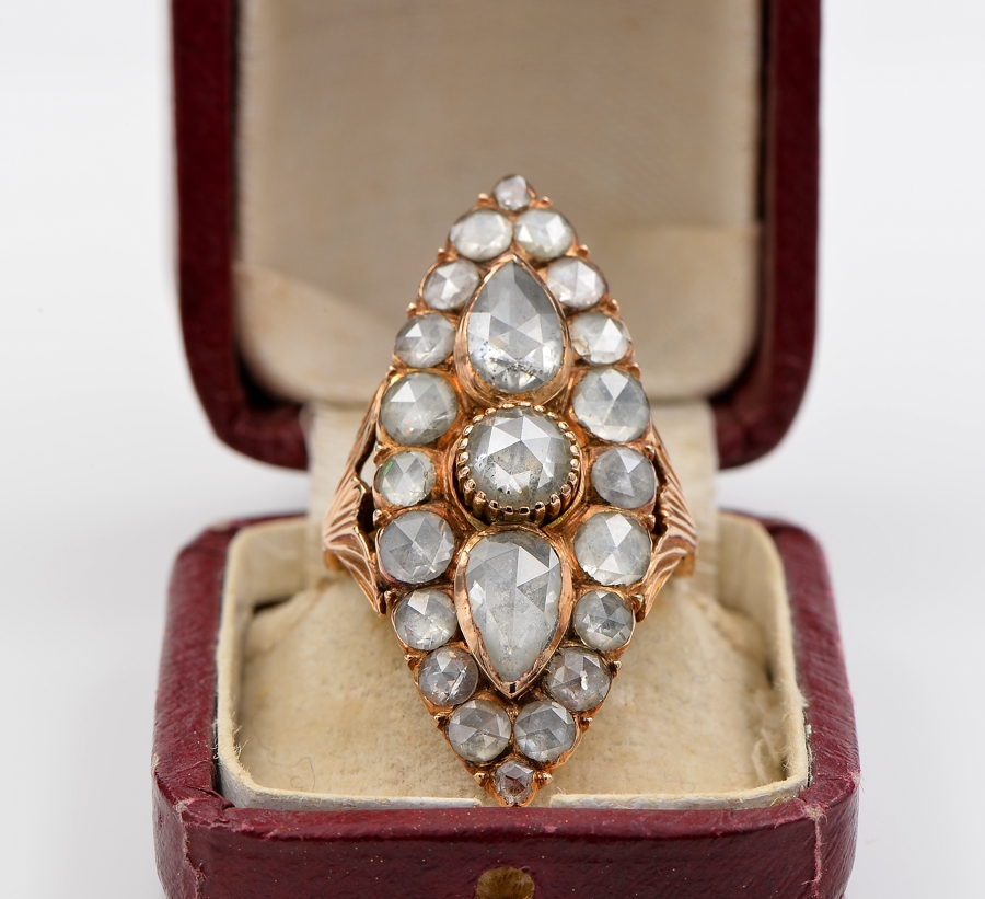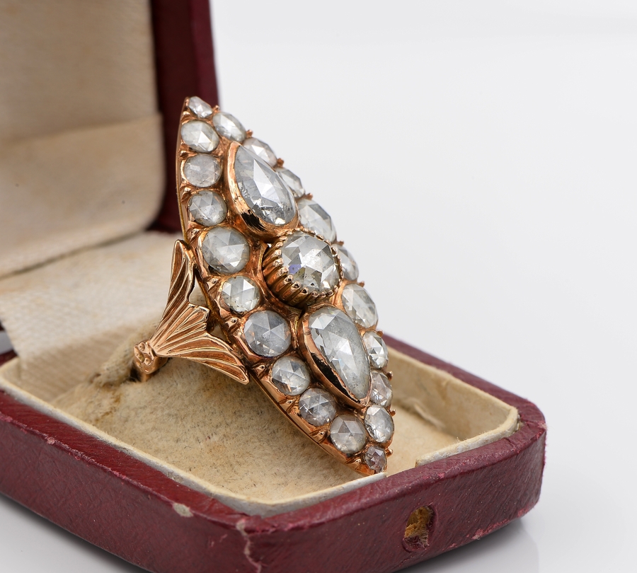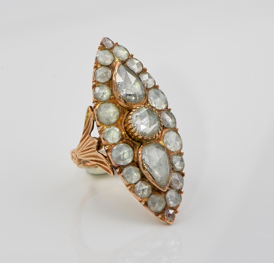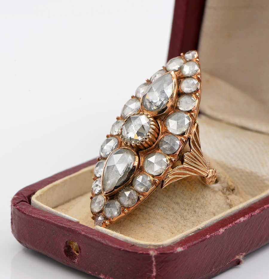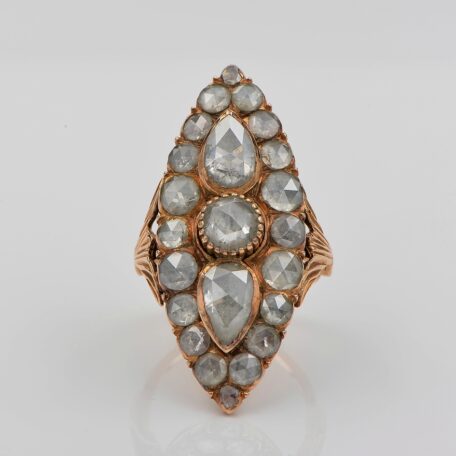 Gems: 1 round Dutch rose cut diamond of approx 1.10 Ct (by spread) – 2 pear Dutch rose cut diamond totalling 2.40 Ct approx (by spread) and 20 round Dutch rose cut diamond totalling approx 3.60 Ct (by spread) – Diamond’s TCW approx 7.10 Ct (by spread)