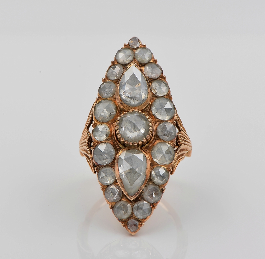Set throughout with 1 round Dutch rose cut diamond of approx 1.10 Ct (by spread) – 2 pear Dutch rose cut diamond totalling 2.40 Ct approx (by spread) and 20 round Dutch rose cut diamond totalling approx 3.60 Ct (by spread) – Diamond’s TCW approx 7.10 Ct (by spread)