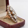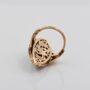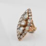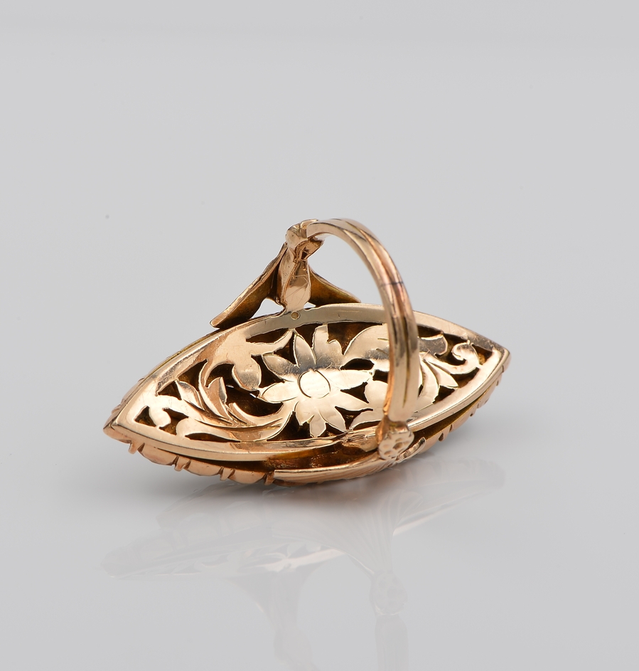 This extremely beautiful and rare navette ring is 19th century, made of solid 14/15 Kt solid gold – tested – boasts an amazing workmanship with carved -Forget Me Not- details on the reverse and rich Diamond crown facing up