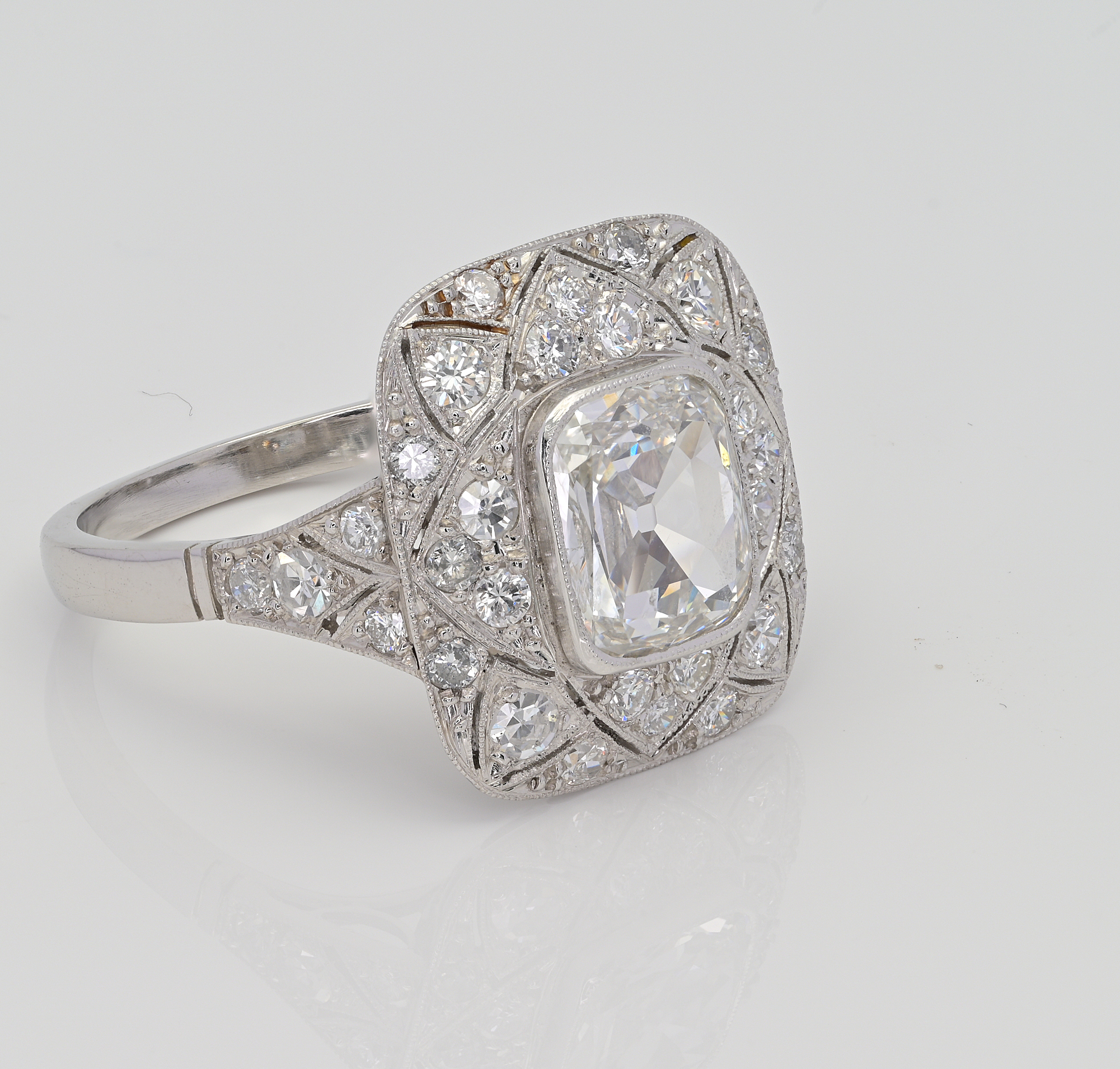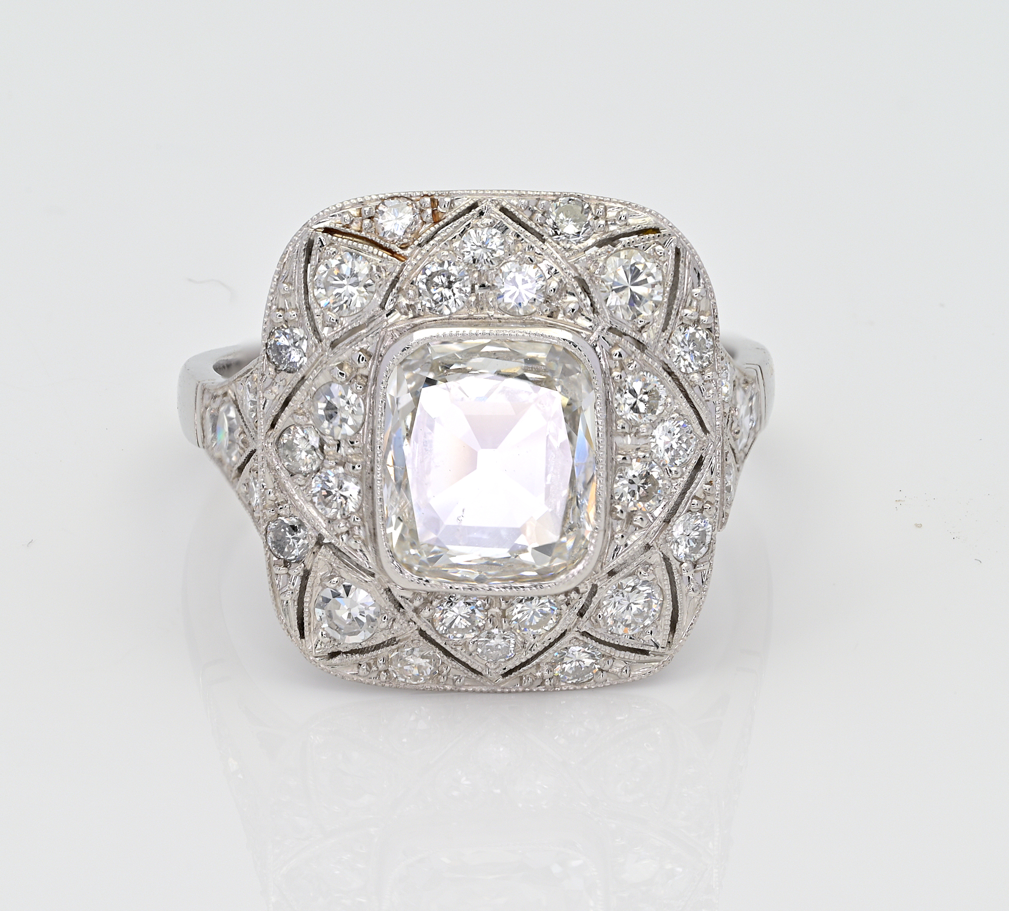 Centering an antique modified rectangular cushion cut Diamond rather flat in cut that spreads for 1.80 Ct (8.13 mm. x 7.12 mm.) measured with a Diamond gauge