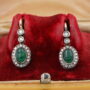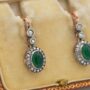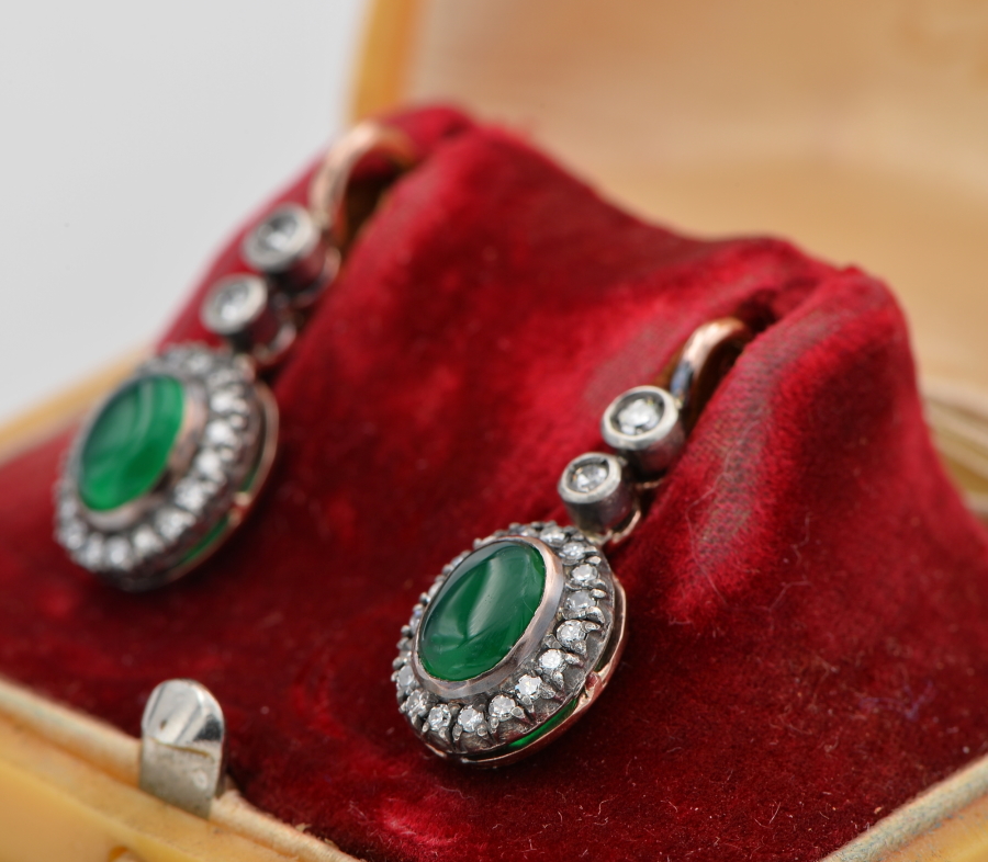 Adorned with a twin Diamond line over the top leading to the oval shaped drop set with natural Chrysoprase cabochon cut , intense rich Green very attractive – approx 1.40 C each enhanced by 40 old Swiss cut Diamonds for .75 Ct altogether – G/I VVS/SI