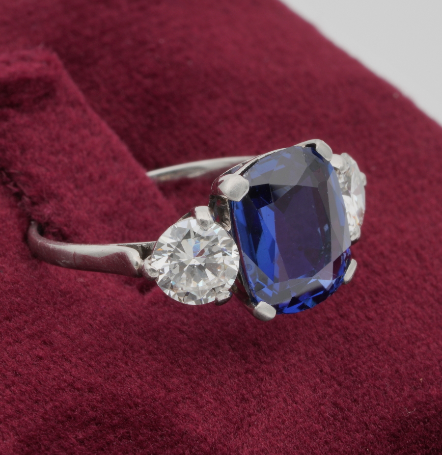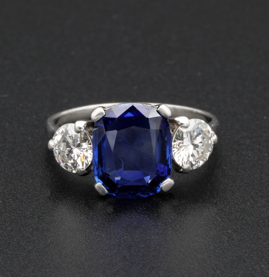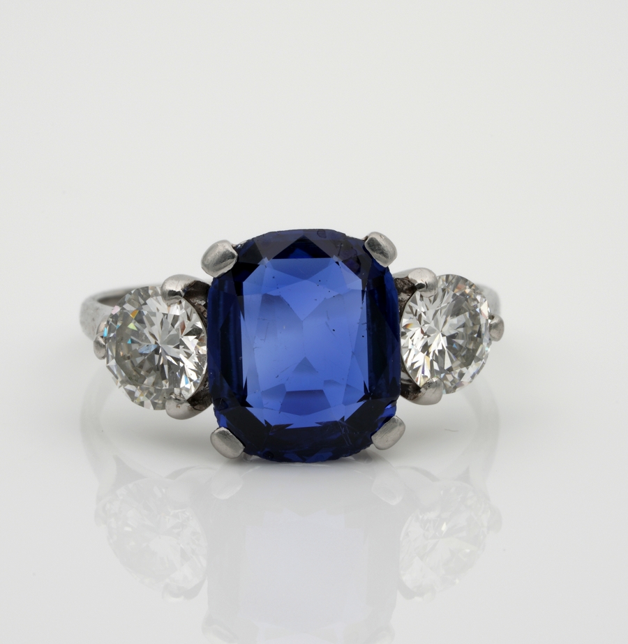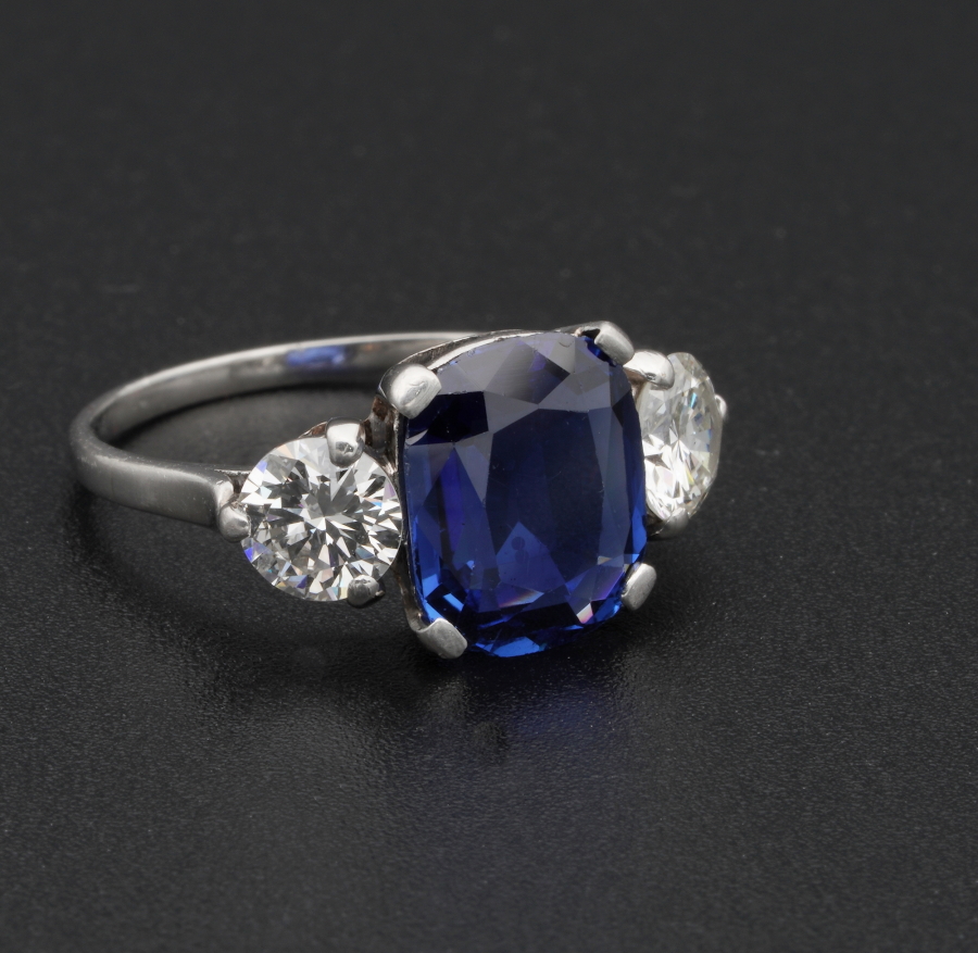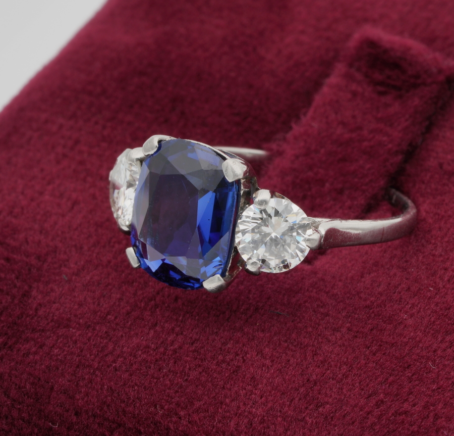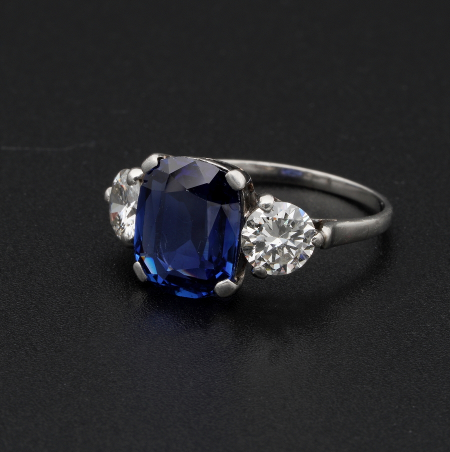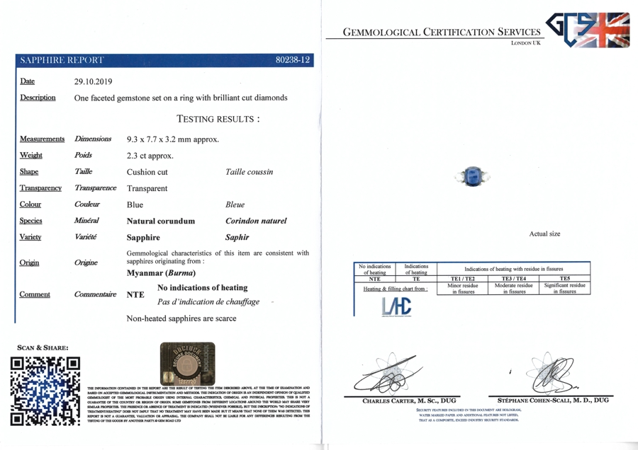 Gems: 1 cushion faceted cut natural unheated Burma blue sapphire of approx 2.30 Ct (9.3 x 7.7 mm.) – 2 brilliant cut diamonds totalling approx 1.00 Ct (G-VVS/VS)