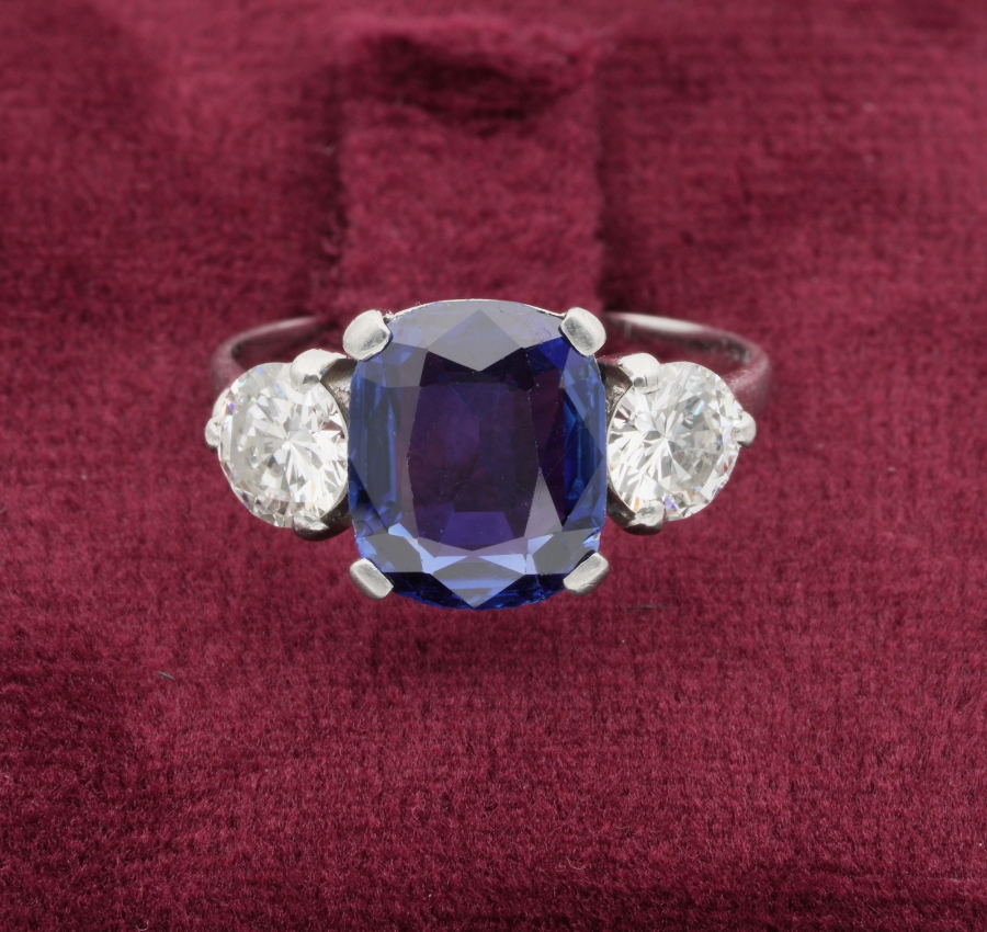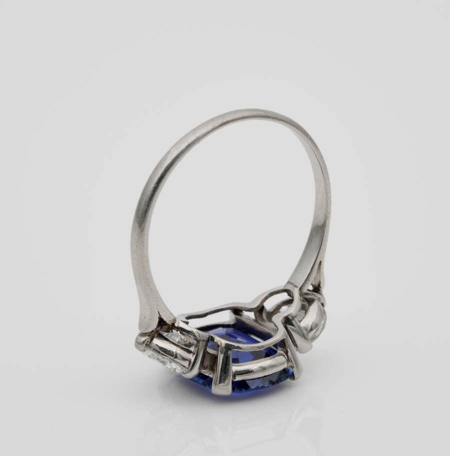 Centre is a superb rich blue, antique cushion cut Burmese Sapphire – no heat or treatment of any sort – which appears to be much larger than its size 2.30 Ct measuring a good 9.3 mm. x 7.7 mm – sometimes you see large carat weight with small look, you cant really say as mother nature makes gemstones like humans every one different from the other, and this Sapphire is a very good compromise between colour, clarity which is exceptional, and size