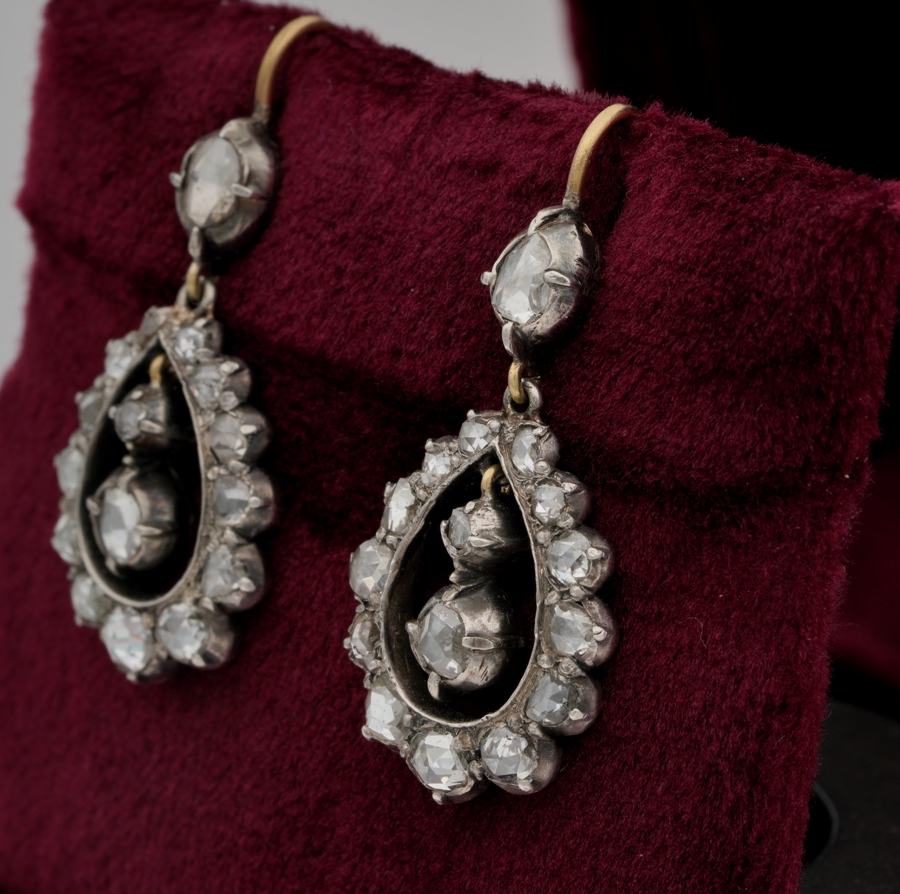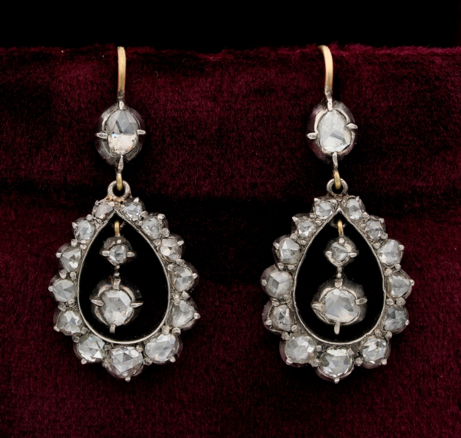 Each set with two graduated rose cut Diamonds suspended with pear shaped halos of further Rose cut Diamonds