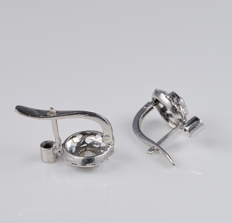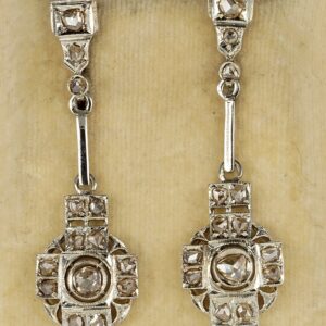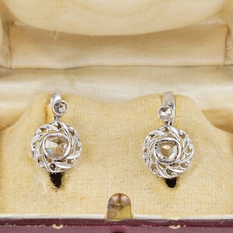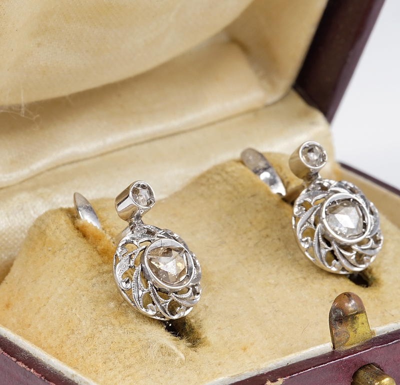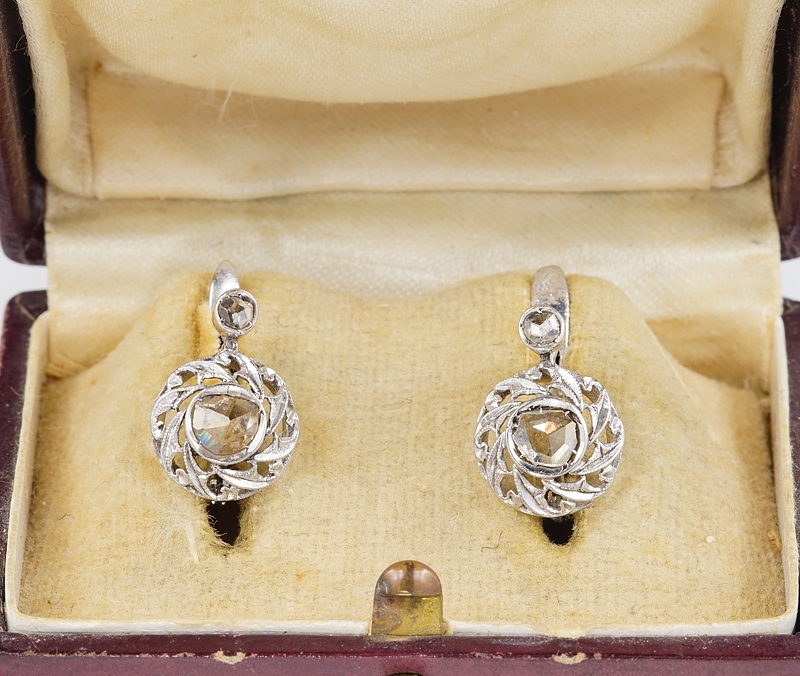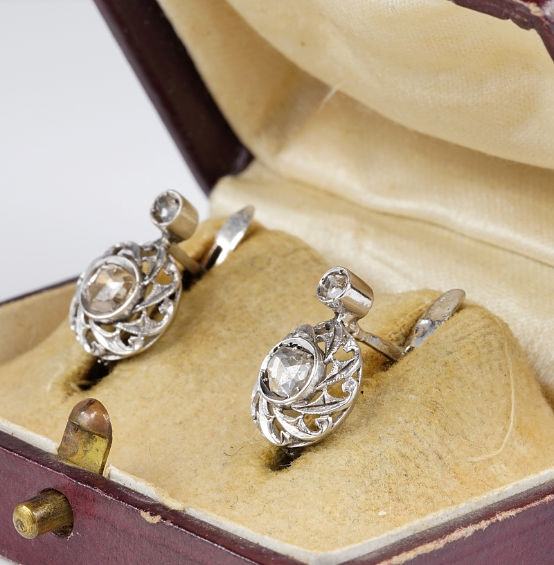 The earrings boast a Diamond rose cut as principle stone topped by a further littler Diamond as used at the time.