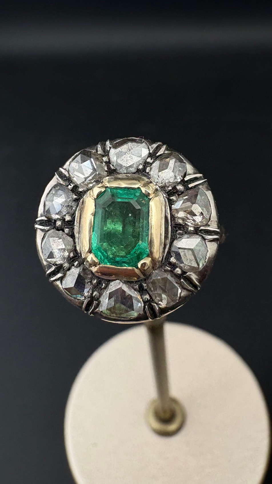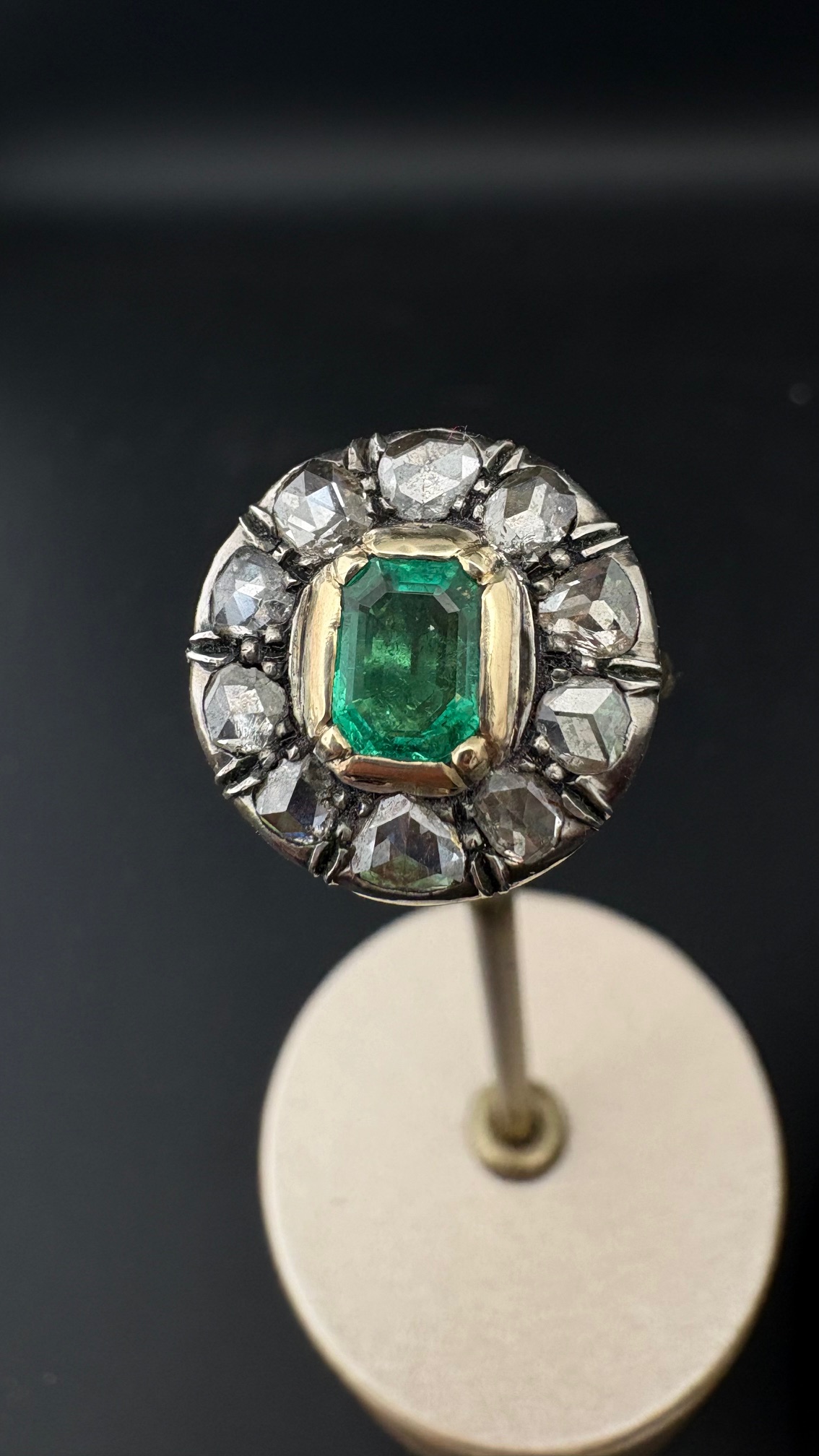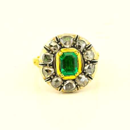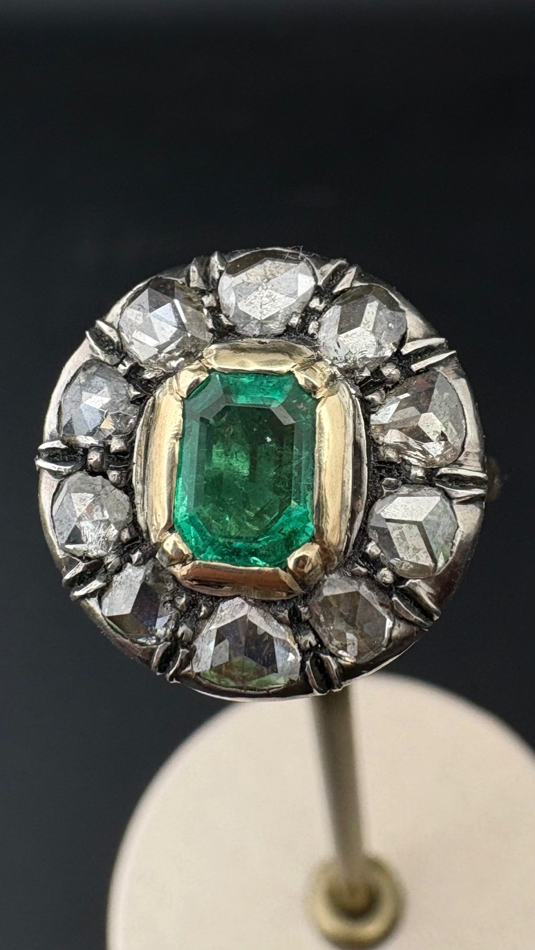 Ring boasts an amazing round design with a centre natural Colombian origin Emerald of approx .75 Ct vivid Green and good transparency, set within a halo of 10 rose cut Diamonds spreading as much as 1.0 full carat .80 approx TCW effective weight.