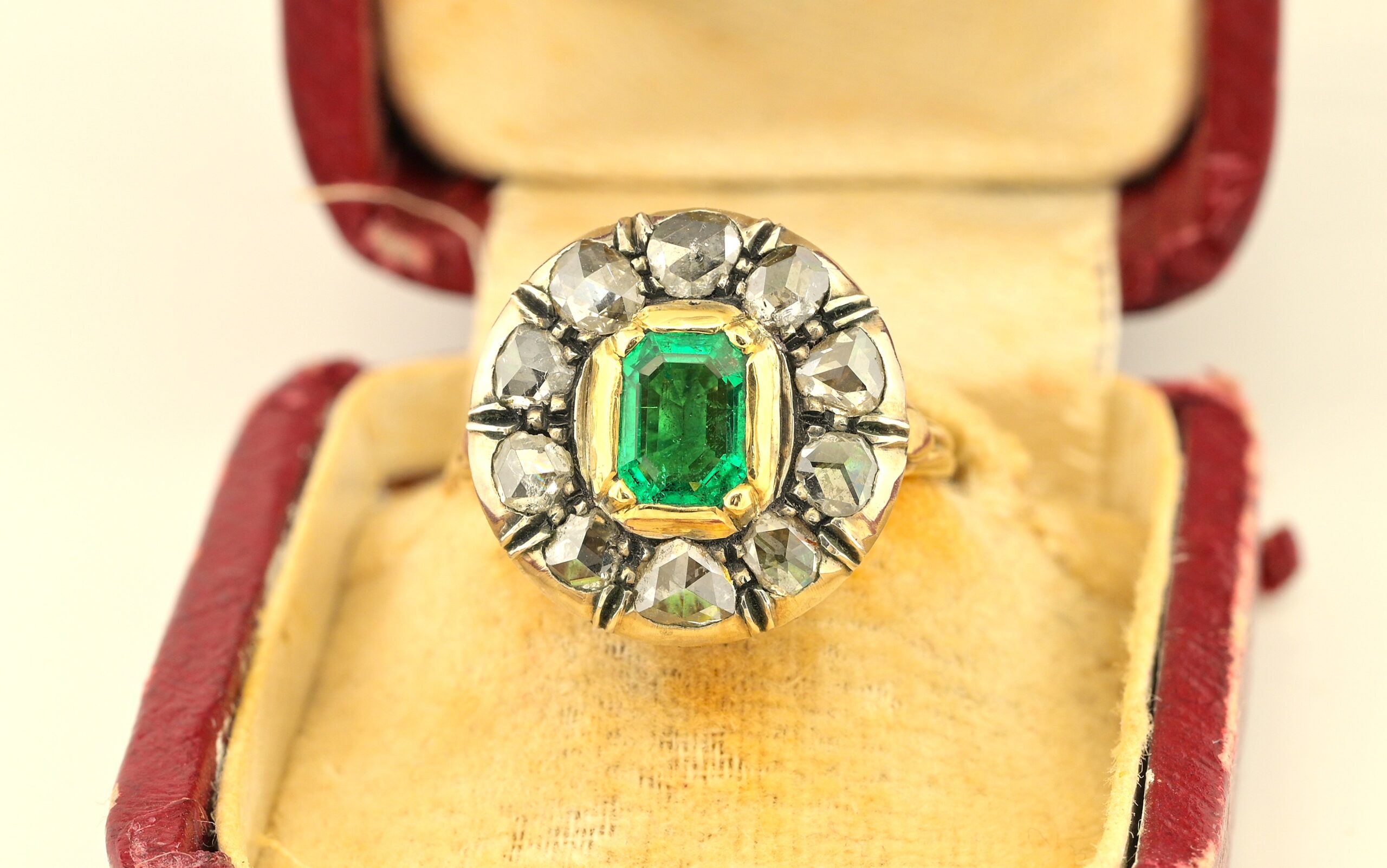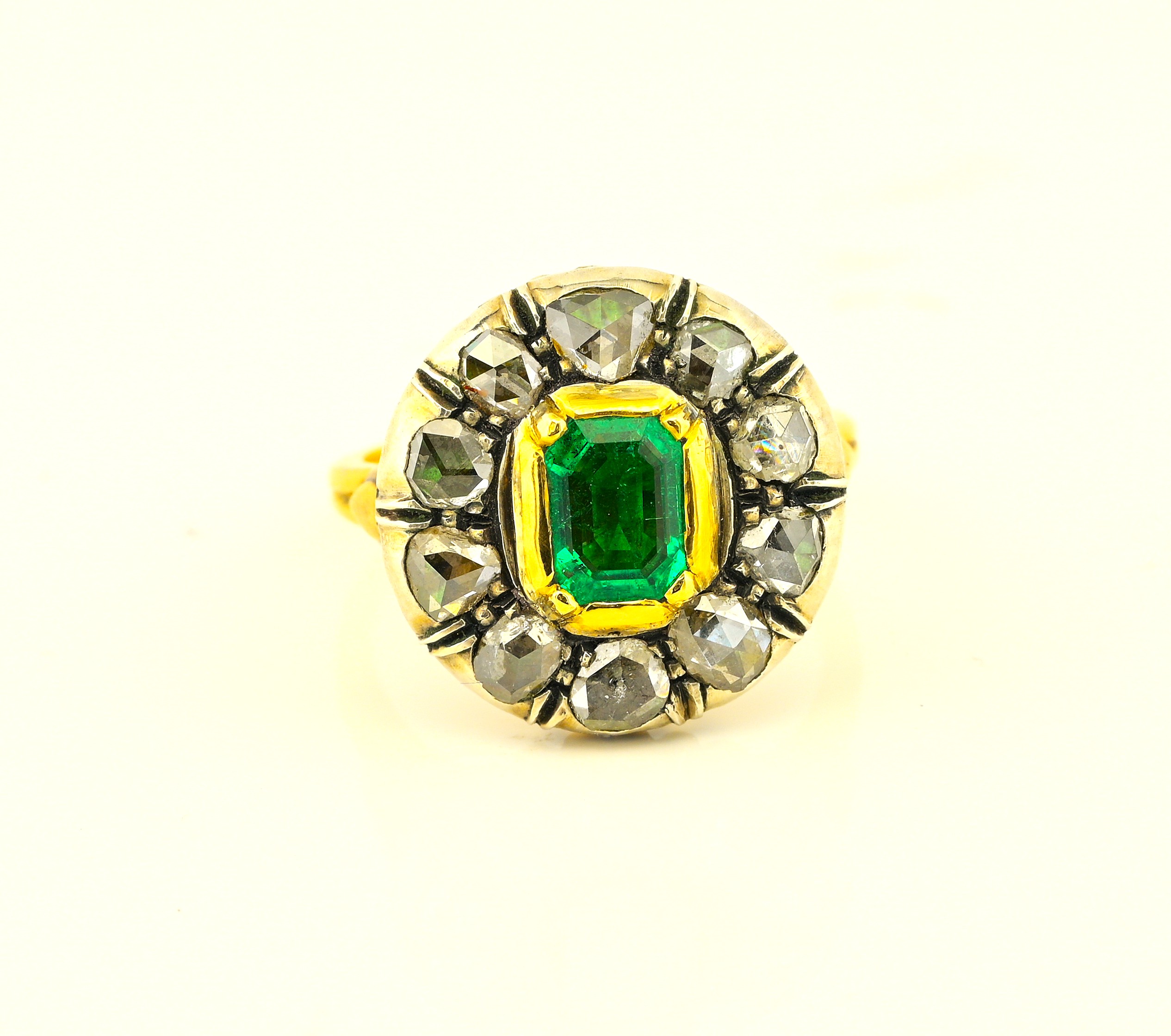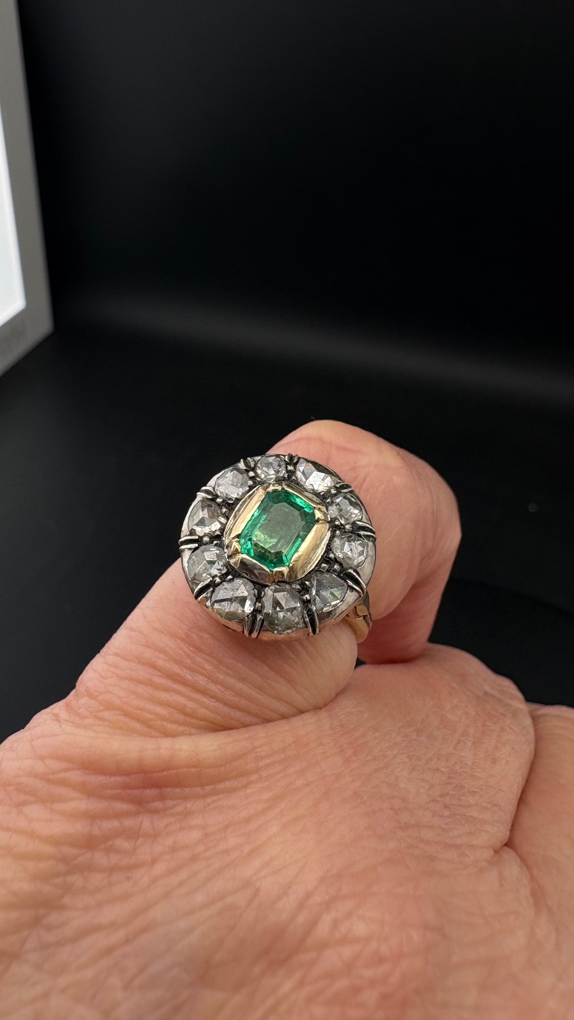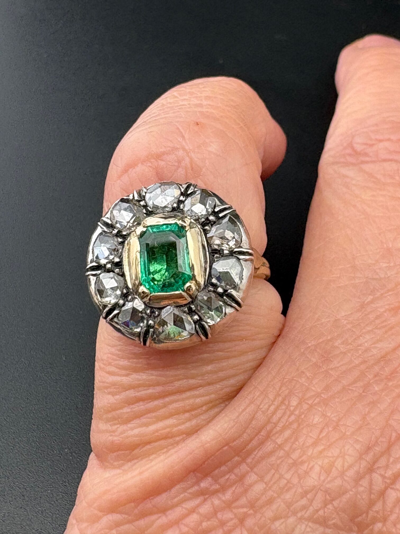 Ring boasts an amazing round design with a centre natural Colombian origin Emerald of approx .75 Ct vivid Green and good transparency, set within a halo of 10 rose cut Diamonds spreading as much as 1.0 full carat .80 approx TCW effective weight.