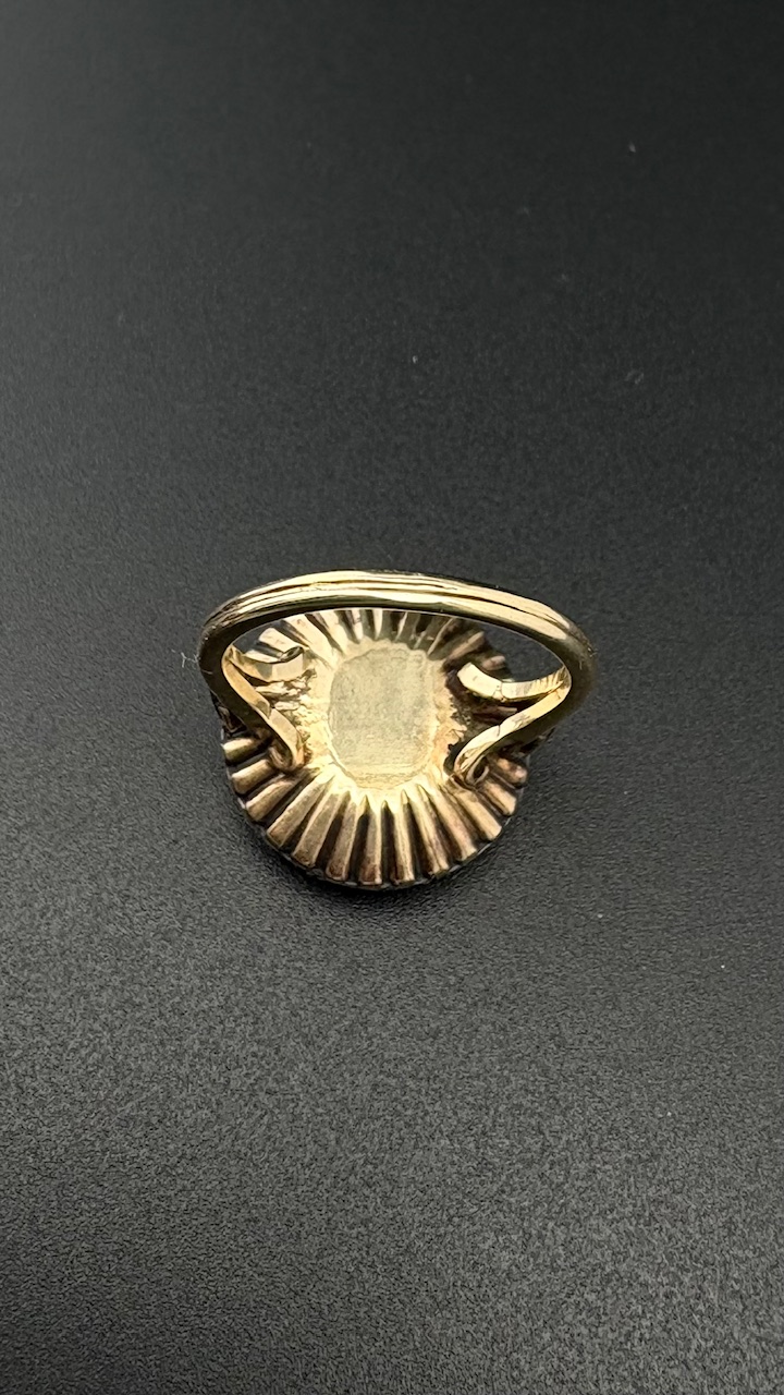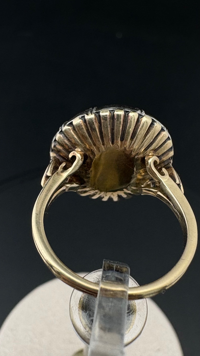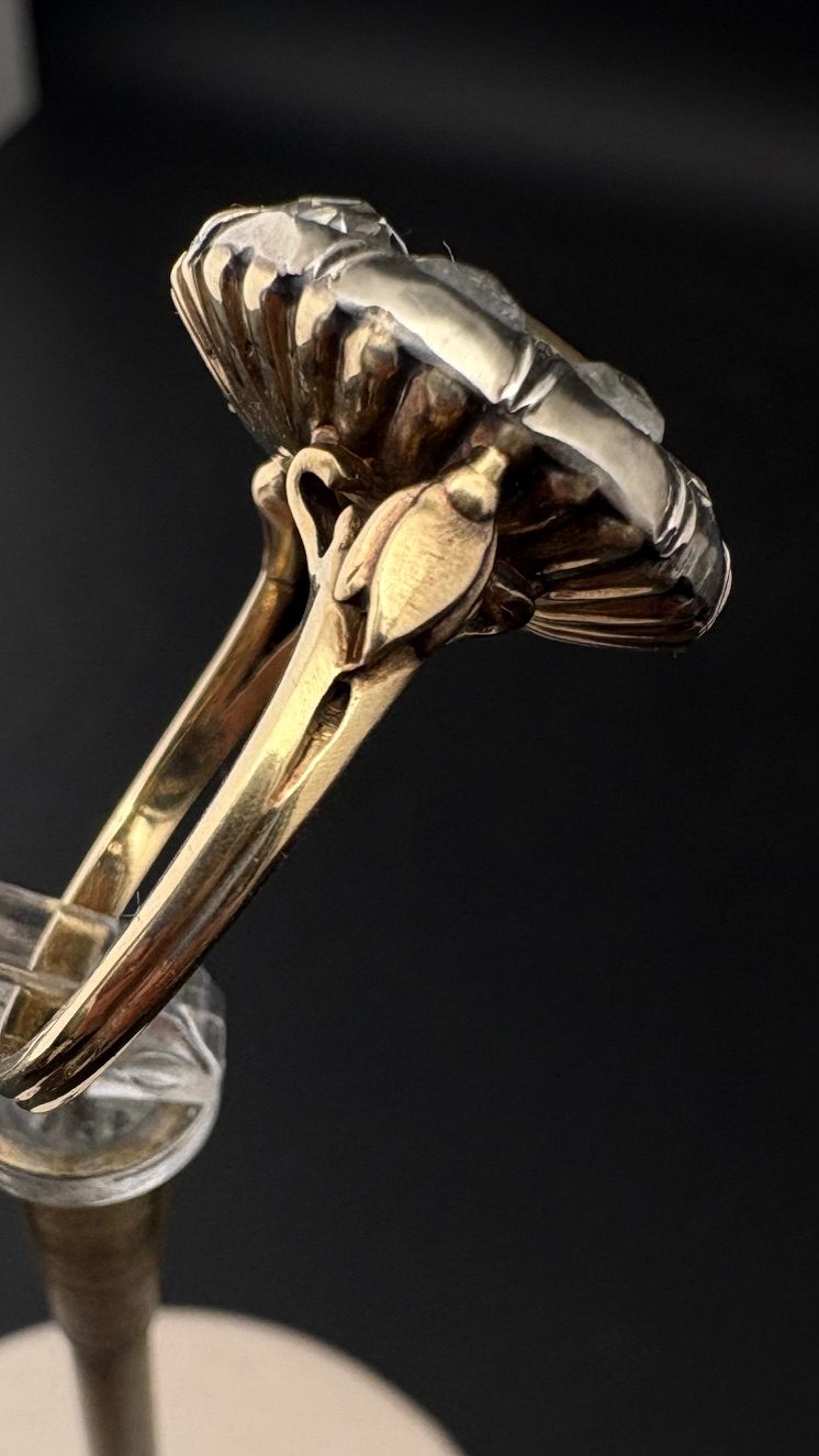 This stunning Georgian ring is dated 1820/1835 ca. Hand crafted of solid 18 Kt except the Diamond housing made of Silver as for the period.