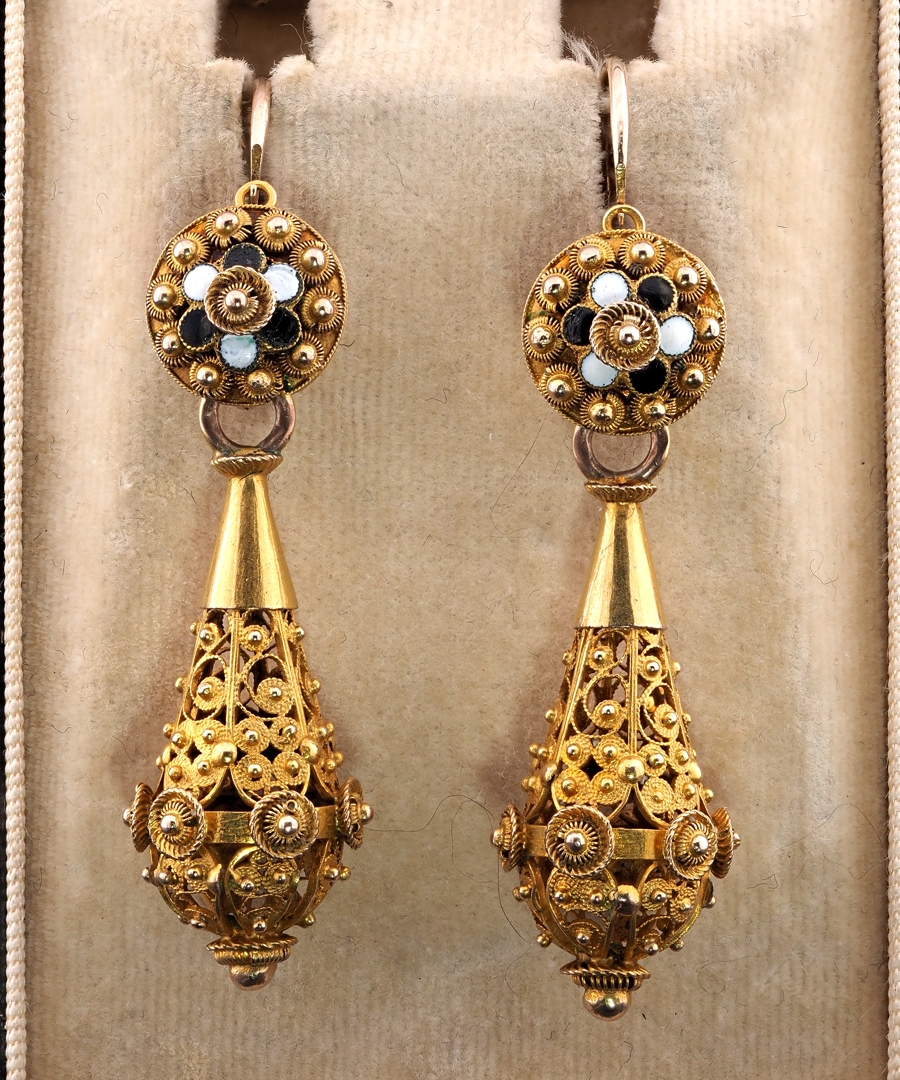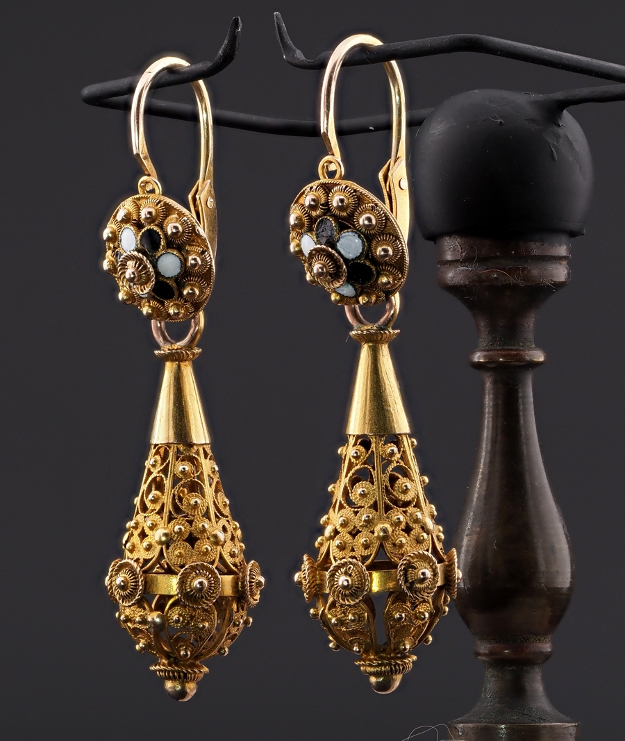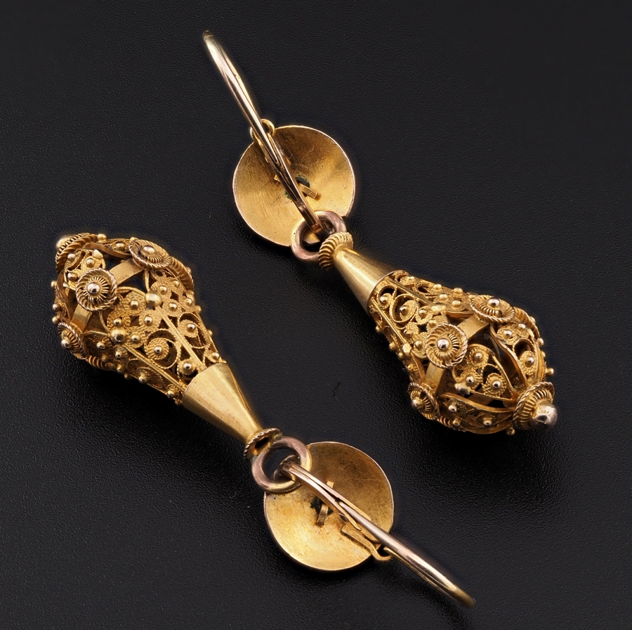 Magnificent Cannetille and granulation work created a surprisingly beautiful artwork and intricate design only by gold spirals and tiny gold beads in vogue during the 1800 ca, which came to an end soon after that period of time for the complexity and time consuming to realize such crafting, hard to get beautiful examples in perfect preserved wearable condition, they are all made of 18 KT solid gold