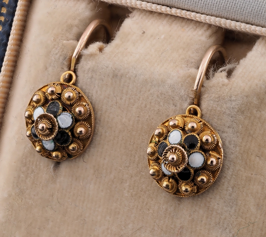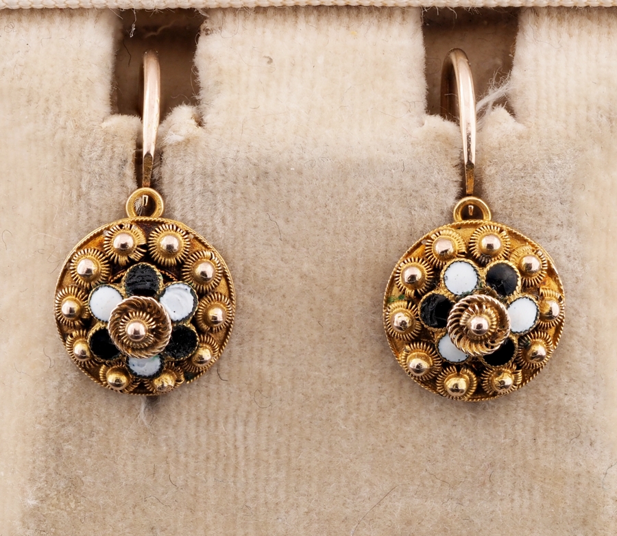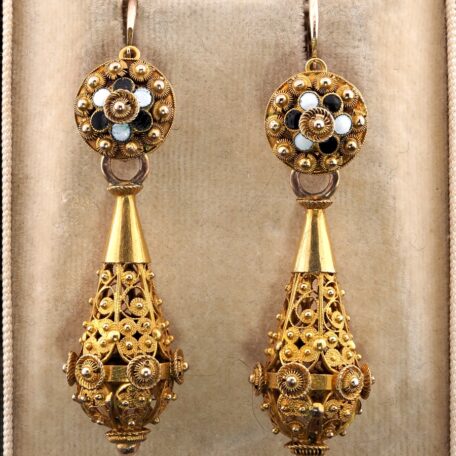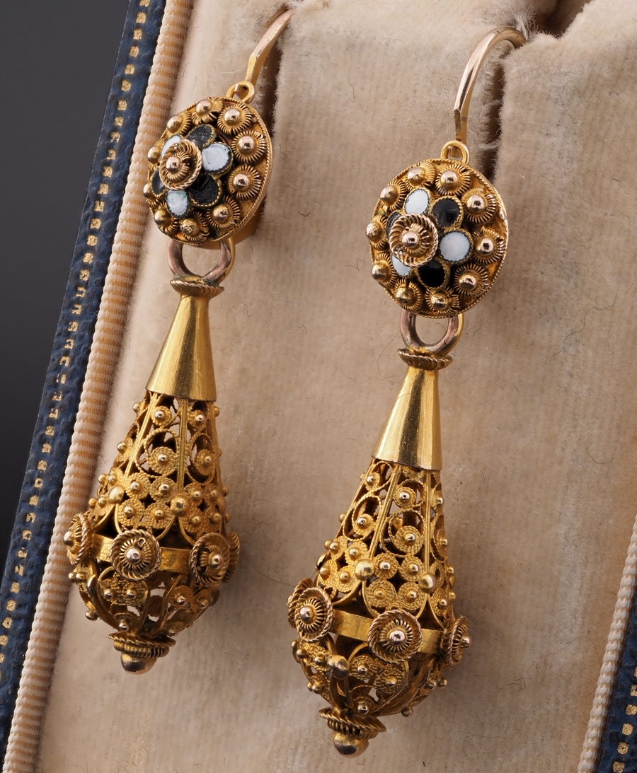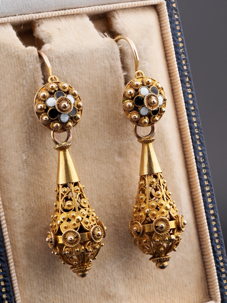 Magnificent Cannetille and granulation work created a surprisingly beautiful artwork and intricate design only by gold spirals and tiny gold beads in vogue during the 1800 ca, which came to an end soon after that period of time for the complexity and time consuming to realize such crafting, hard to get beautiful examples in perfect preserved wearable condition, they are all made of 18 KT solid gold
