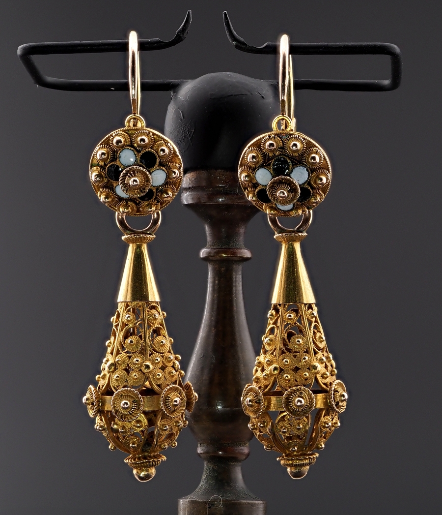 Marvellous and quite spectacular art work from the Georgian period are these long torpedo night/day earrings, authentic 1800 ca