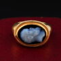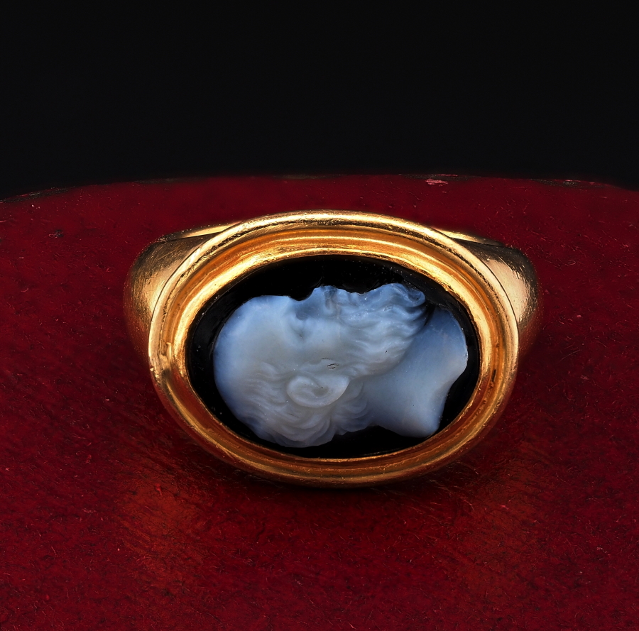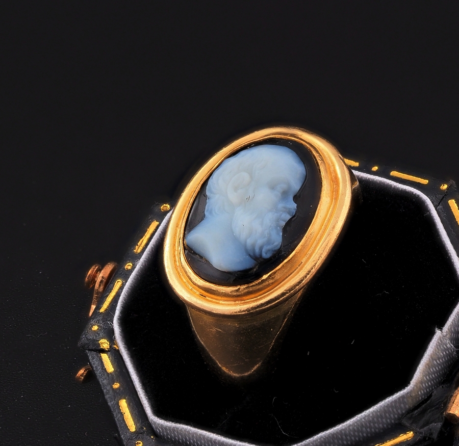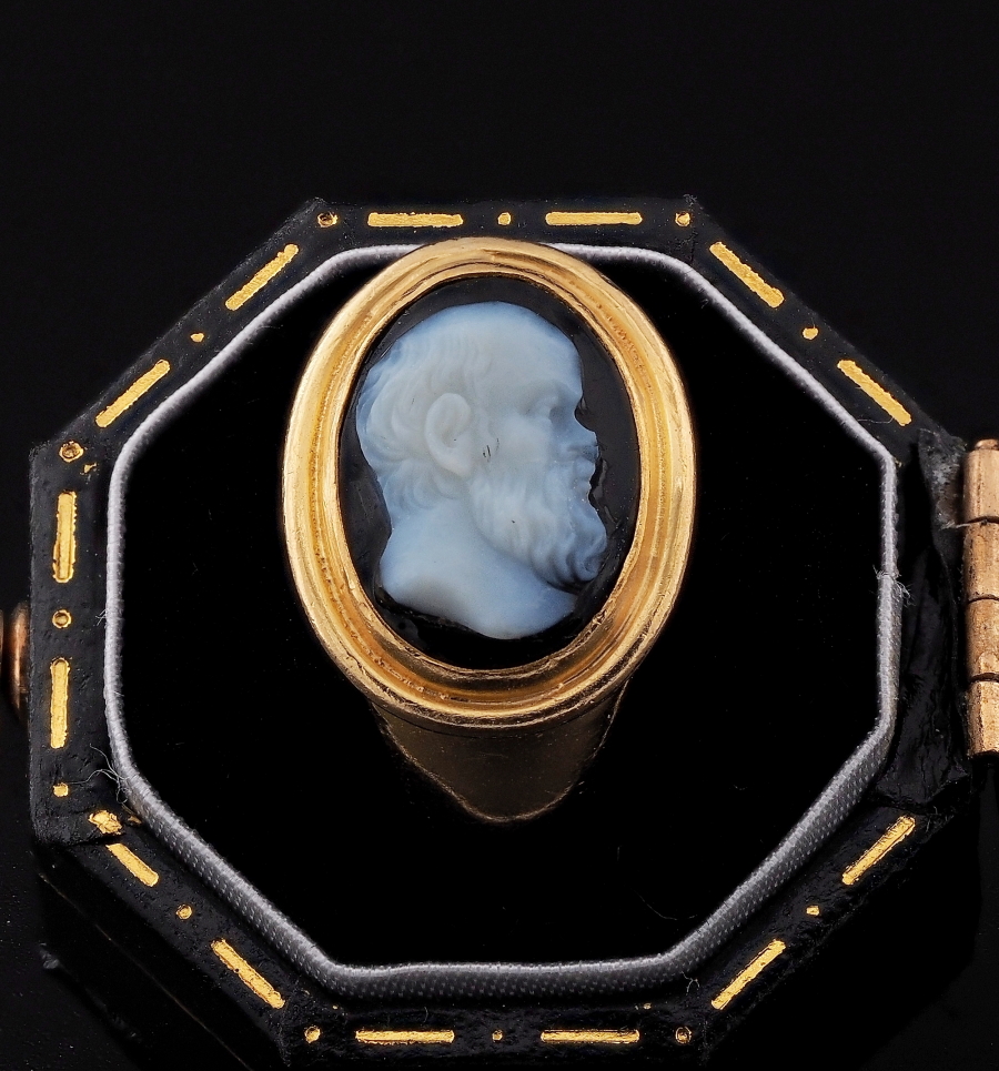Featuring a face right profile of Socrate skilfully carved from Agate, cameo possibly older than Georgian, the ring is 1800/ 1820 ca