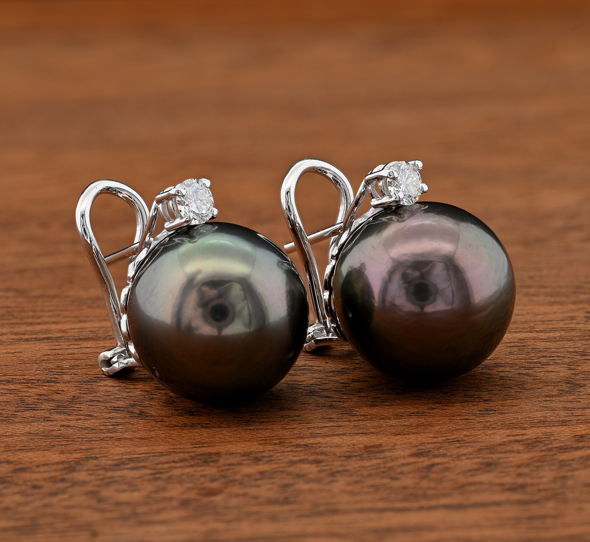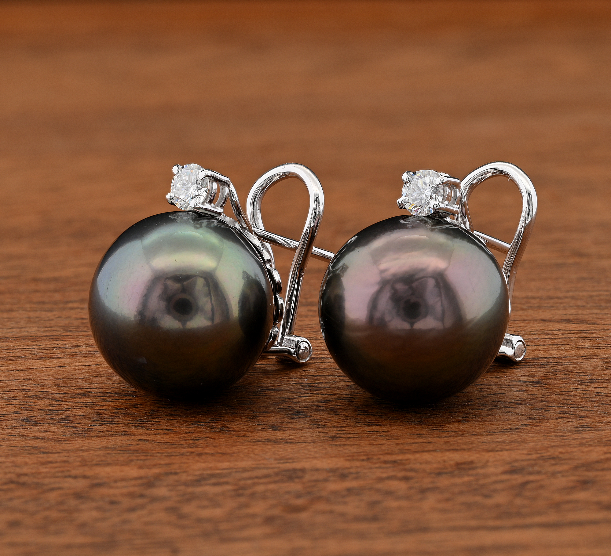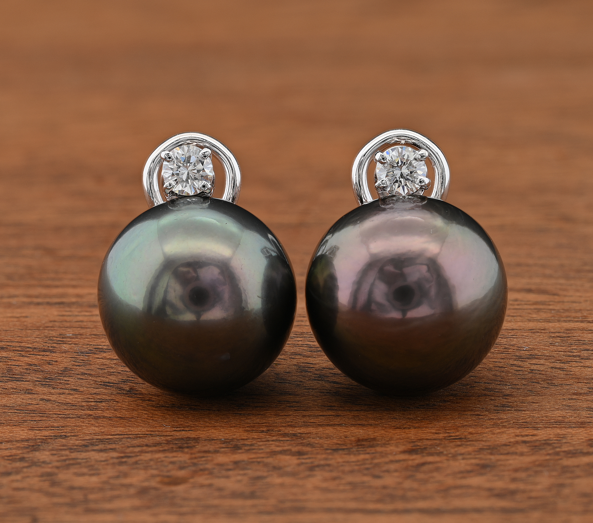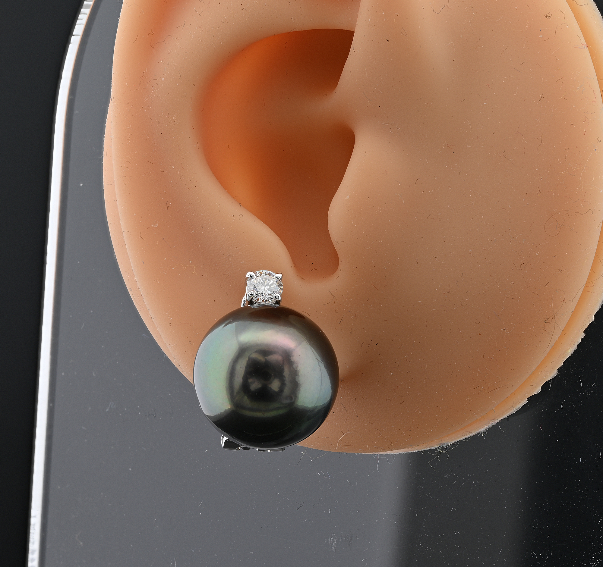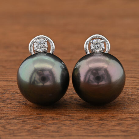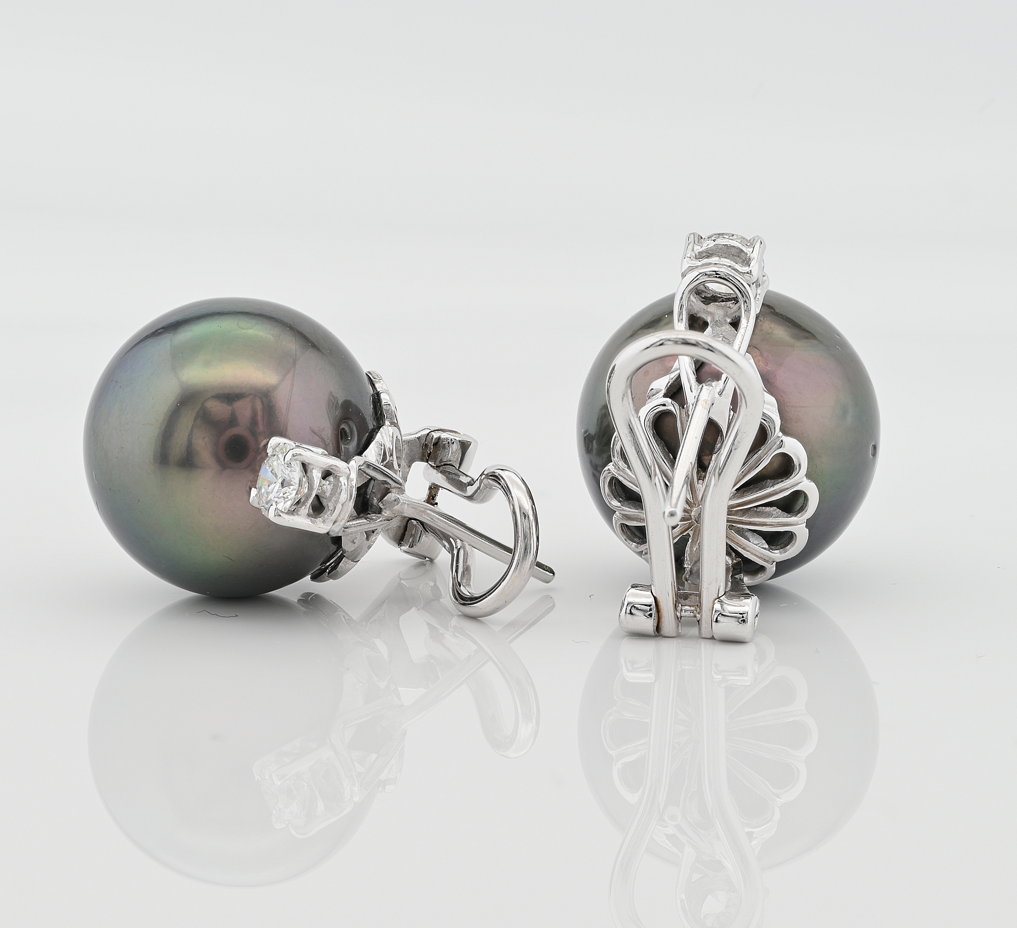 Gems: 2 Tahitian black pearls of 15 mm in diameter each 2 brilliant cut diamonds totalling approx .40 Ct (G/H-VVS/VS)