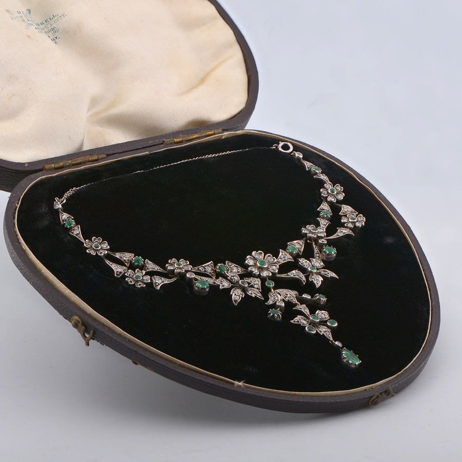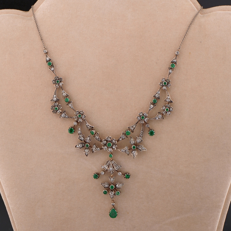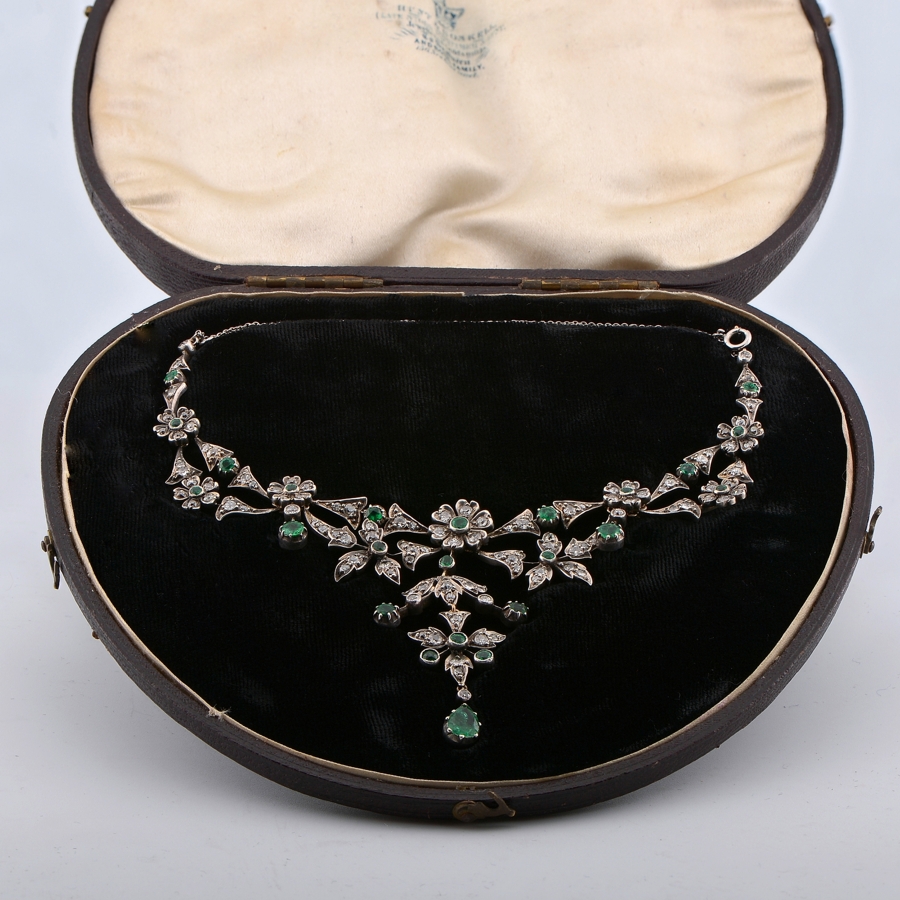 Set throughout with a selection of luxurious jungle green natural Emeralds, old mine cut, in combination with antique old mine cut Diamonds, bright white full of sparkle, approx 5.0 Ct the combined weight for all gemstones