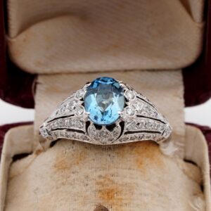 Flanking the Aquamarine stone on either side are 8 Swiss cut diamonds totalling approx .14 Ct