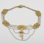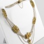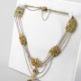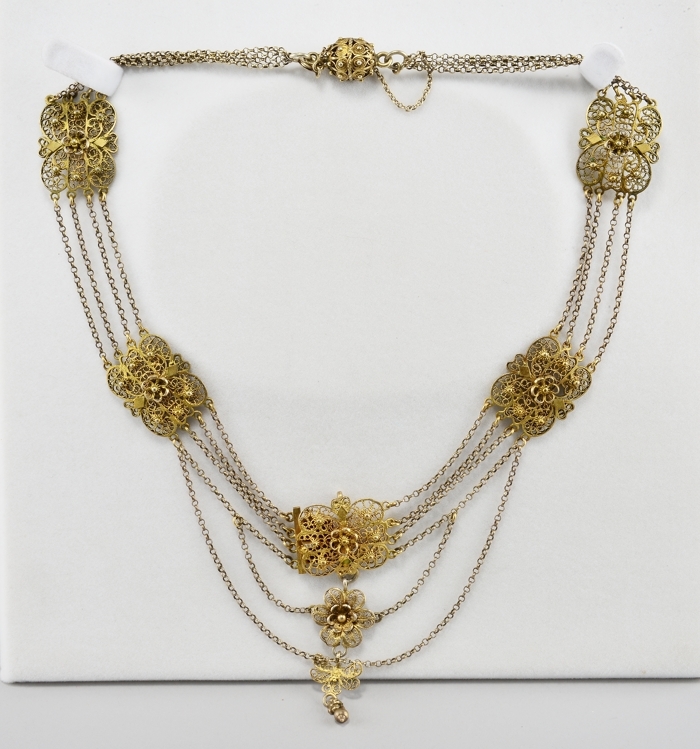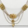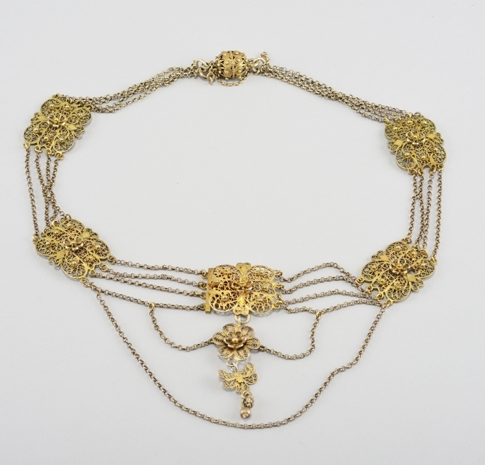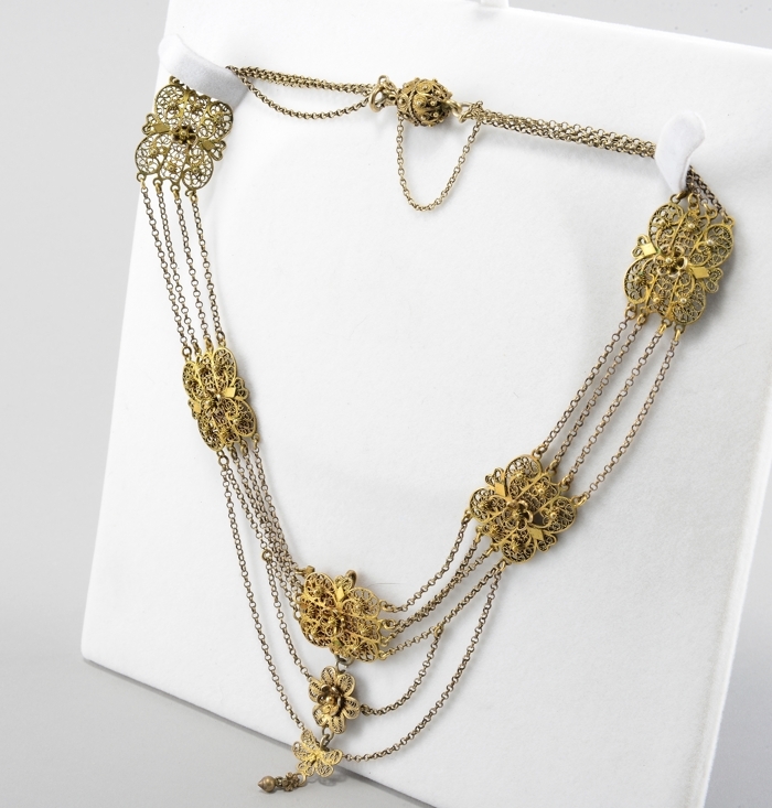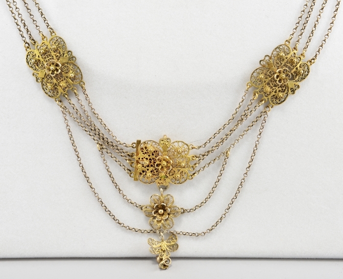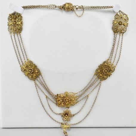 The necklace is made of a great multi chains work linking each other by five plaques of the most amazing filigree work ever seen delicate like a Venetian trim leading to the main piece which is in swag design made with chains and a three section Filigree connecting all the chains together