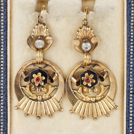 Traditional Victorian 18 Kt solid rose gold beautifully designed earrings comprising many articulated sections of gold with all the motifs in vogue at the time