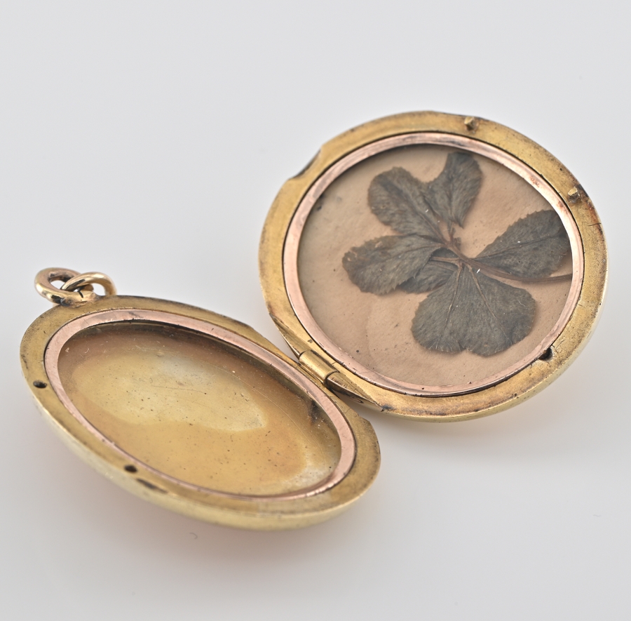 Good sized, entirely hand crafted of solid 14 KT gold, it has long worked as a keeper of romance or past memories, still keeping a dried qua-trefoil as good luck wisher treasured inside