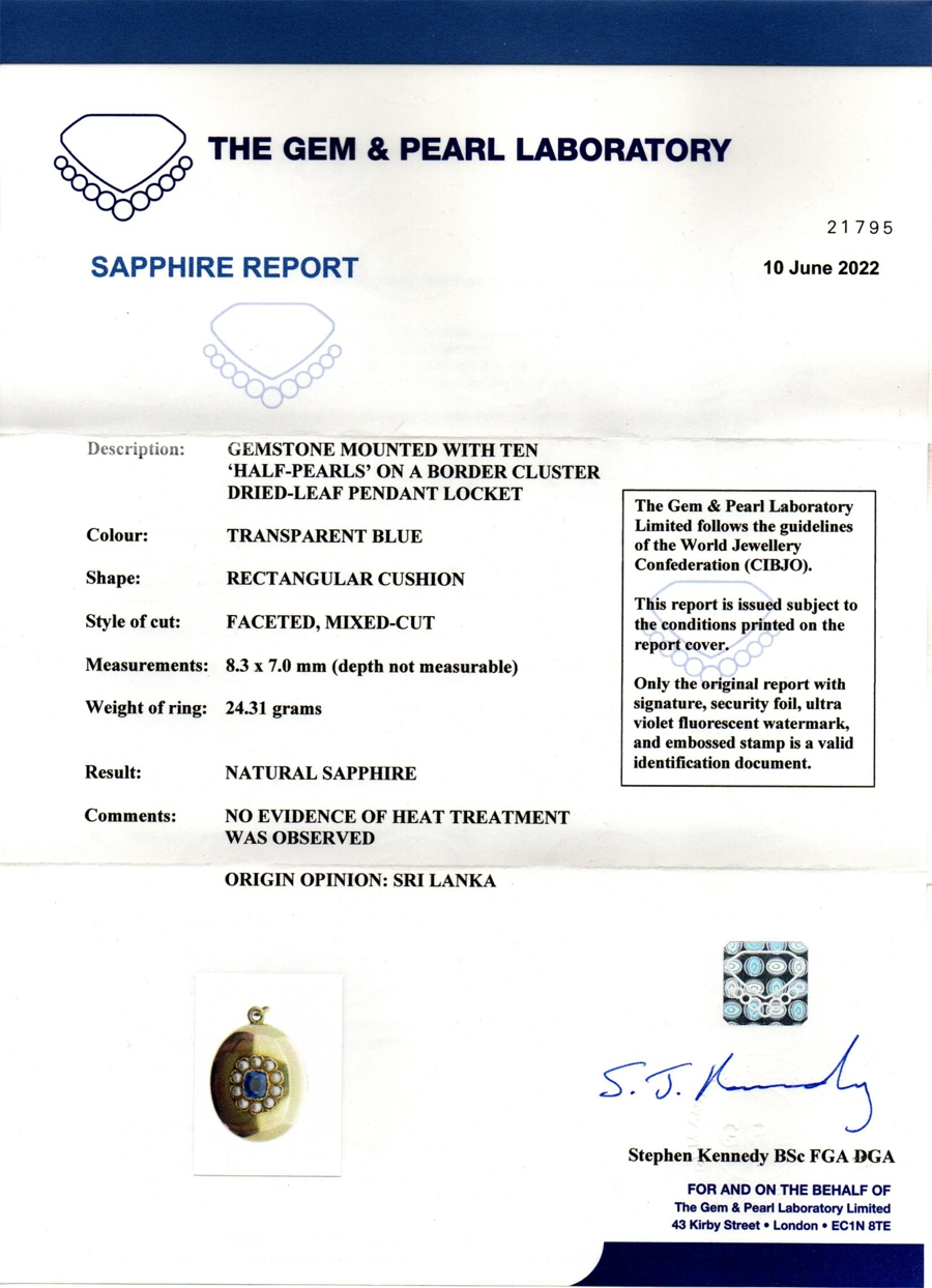 Gems: 1 rectangular cushion natural no heat Ceylon sapphire of 8.3 x 7 mm. (approx 2.60 Ct by spread) 10 natural salt water split pearls of 3.8/4 mm. in diameter