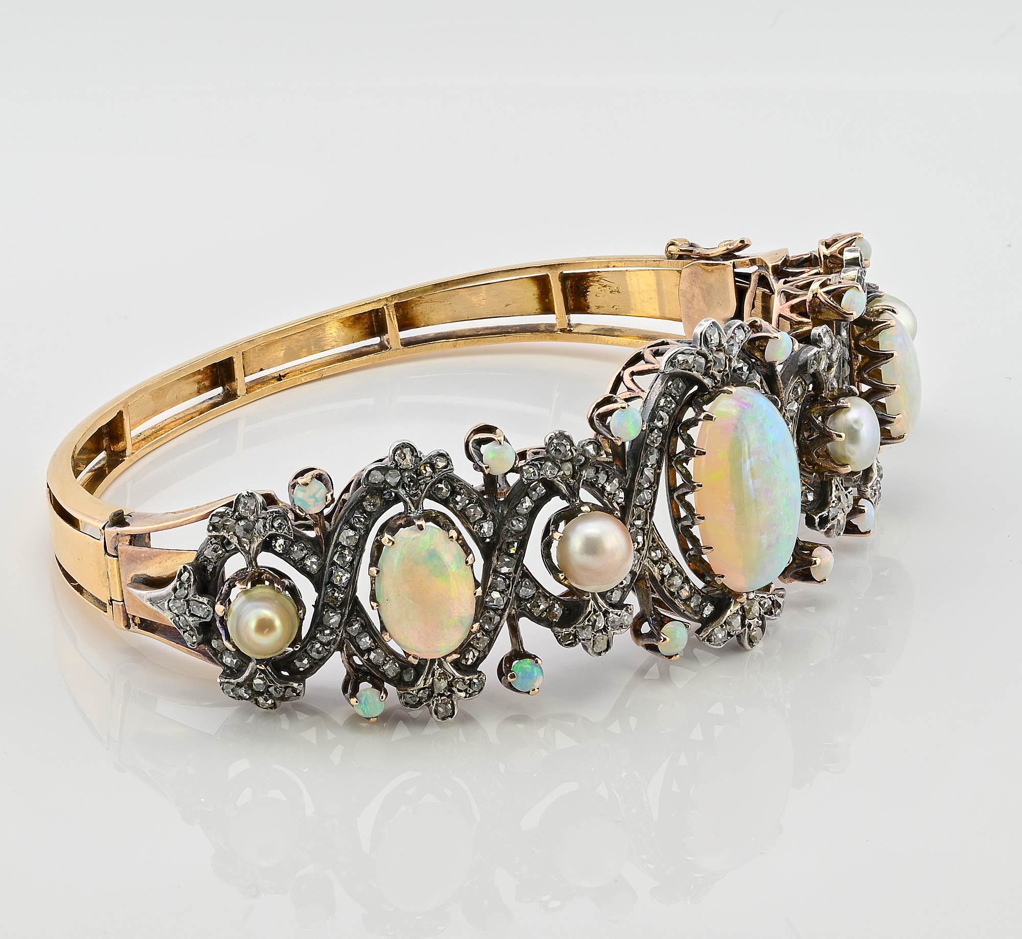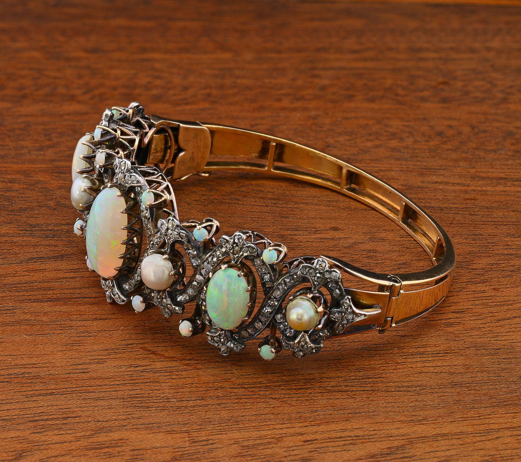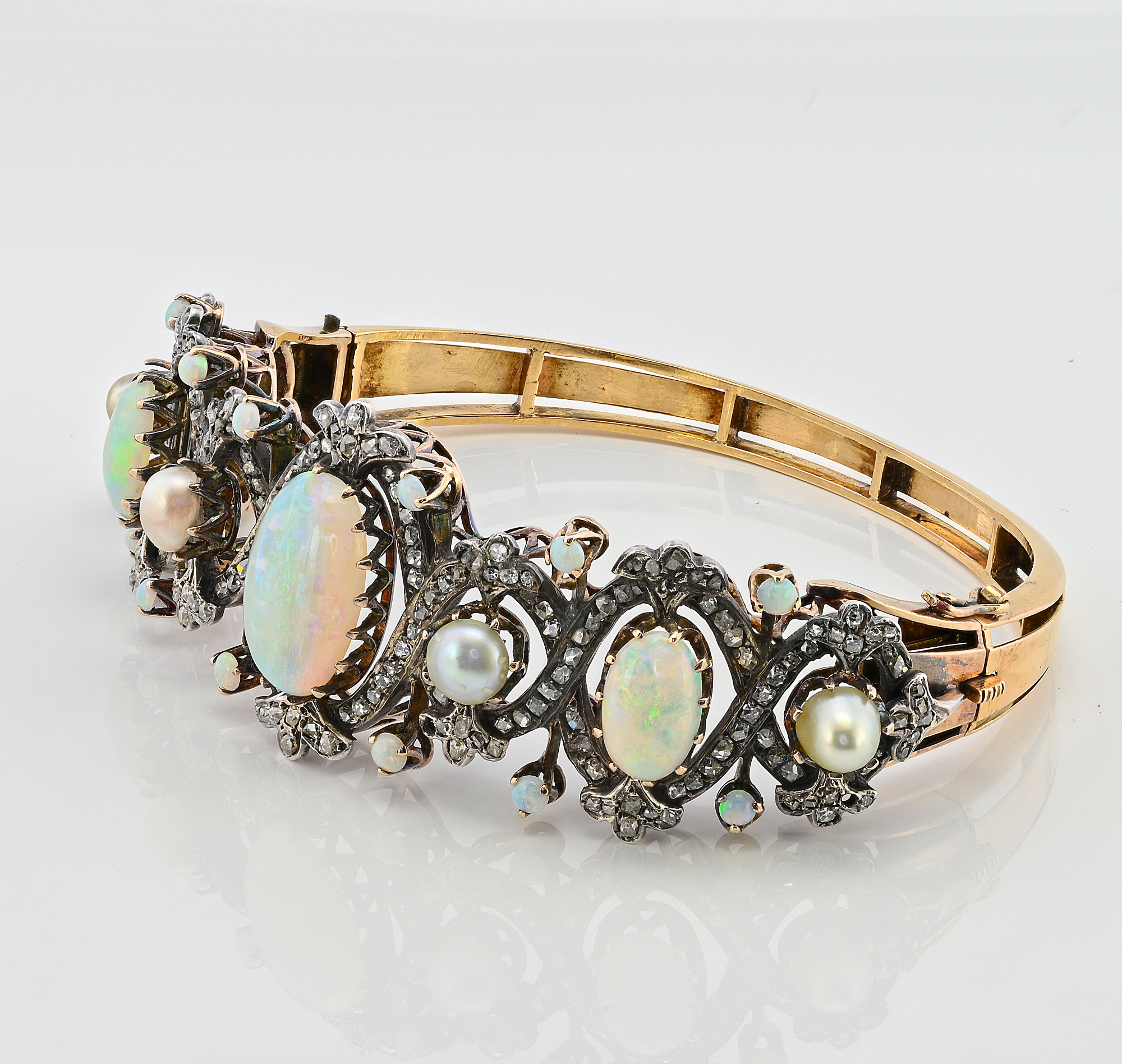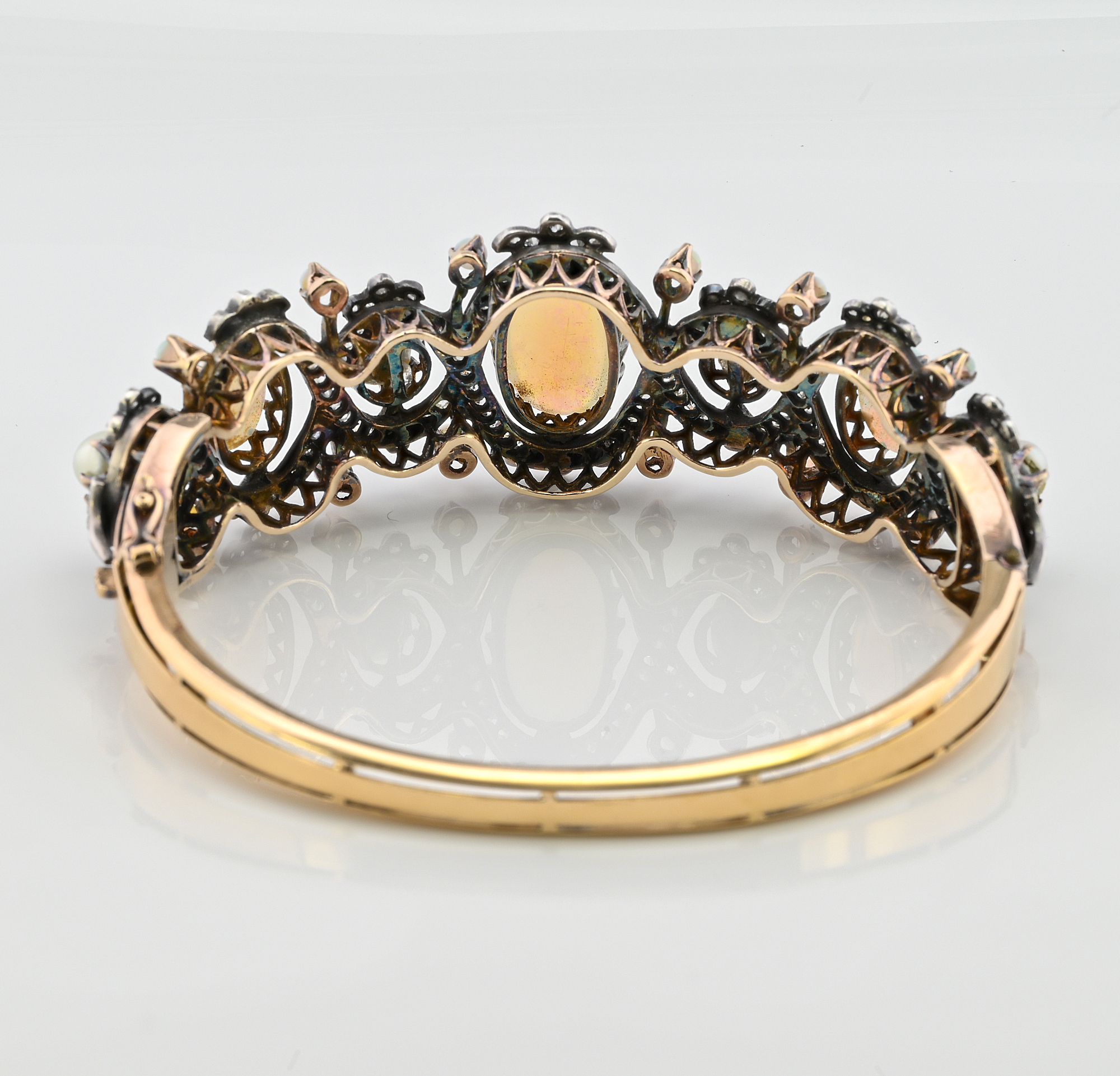 Victorian 5.58 Ct Opal Diamond Pearl 18 KT Bangle