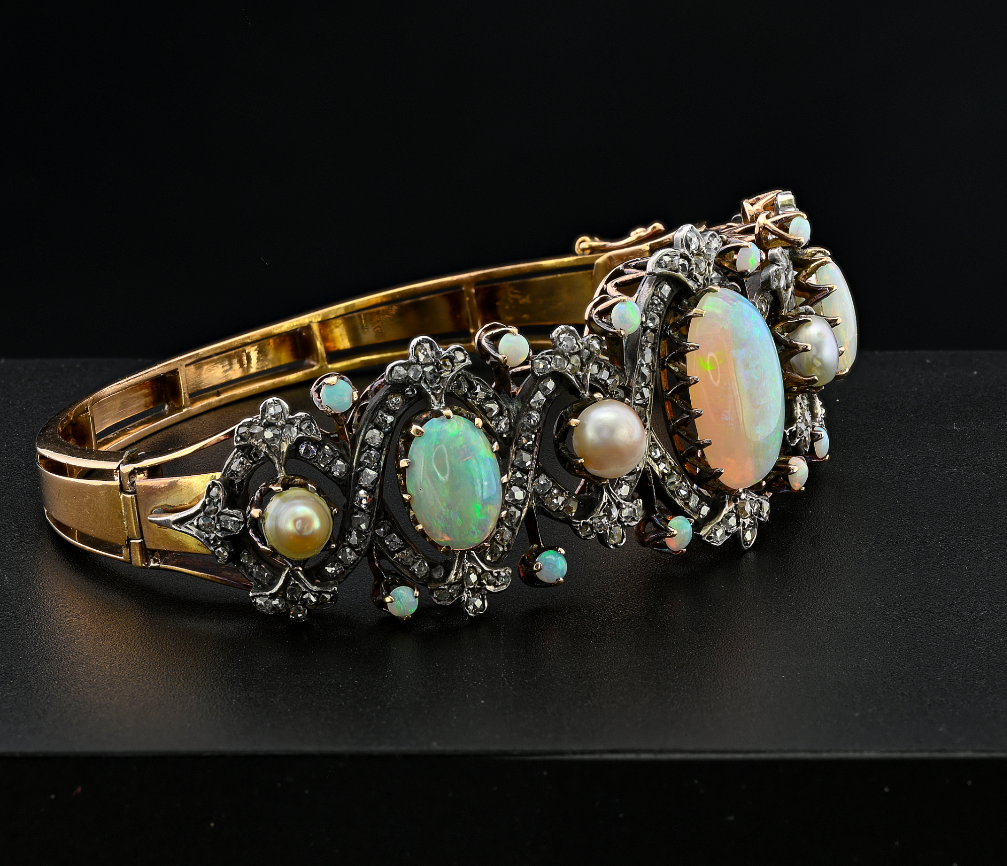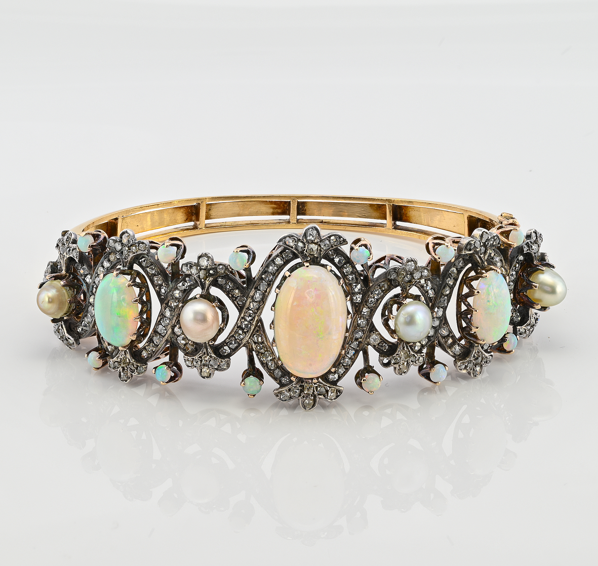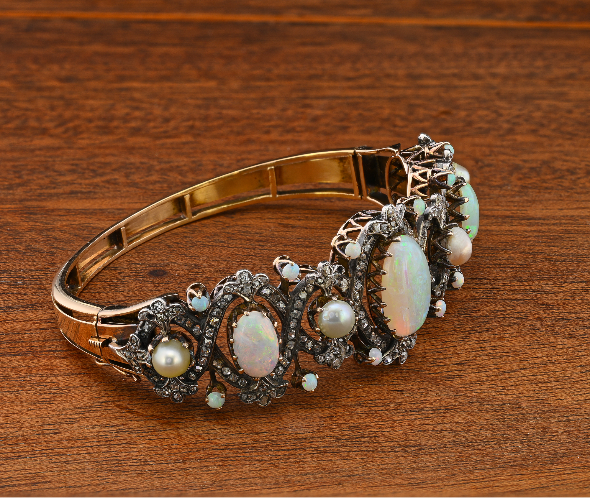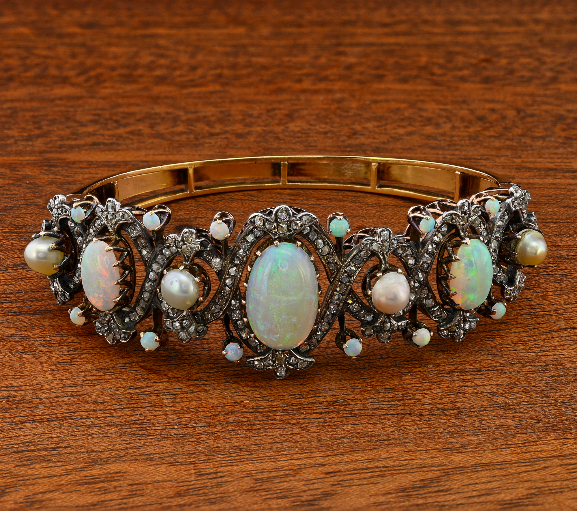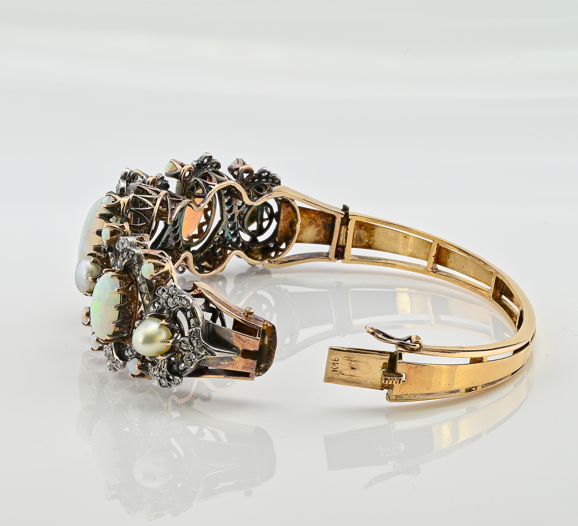 Victorian 5.58 Ct Opal Diamond Pearl 18 KT Bangle