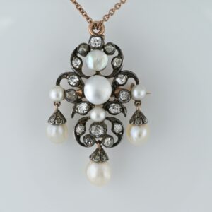 Gems: 3 oval cabochon cut natural opals totaling approx 5.58 Ct (.97 Ct 9.8 x 6.2 mm – 3.38 Ct 15.15 x 9.34 mm -1.23 Ct 9+.98 x 6.96 mm) – 12 round cabochon cut natural opals of 2.6 mm in diameter each – 4 natural (not nucleated) salt water pearls of 5.1 – 5.25 – 5.35 – 5.31 mm in diameter – 177 table cut diamonds totaling approx 3.20 CT (H/I-VVS/SI)