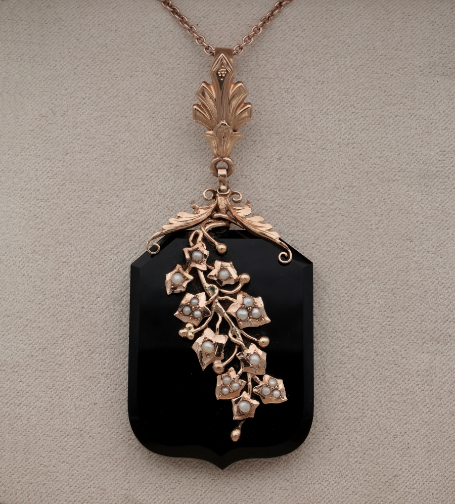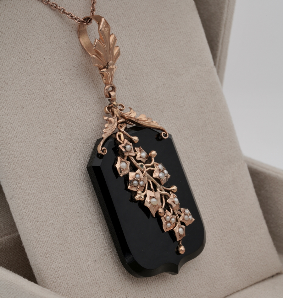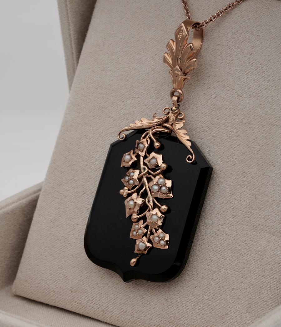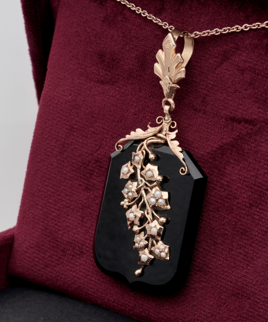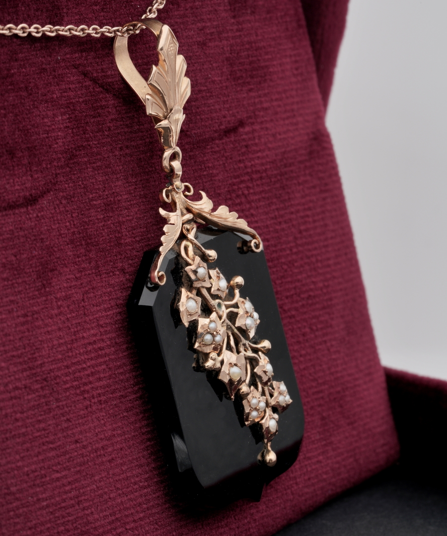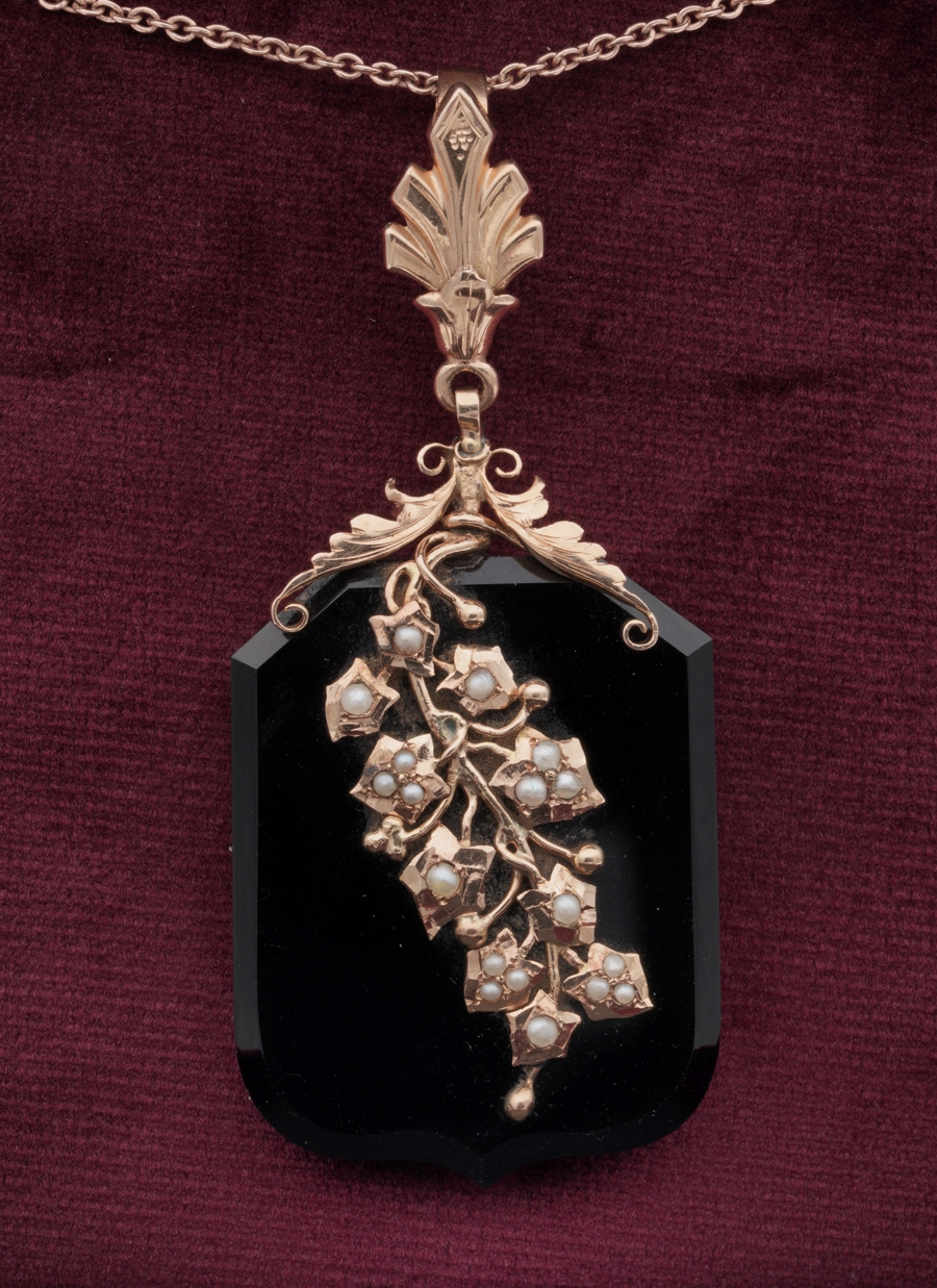 Gems: 1 shield shaped black onyx of 36 x 28 mm. – 19 natural pearls ranging in diameter from 1 to 2 mm.