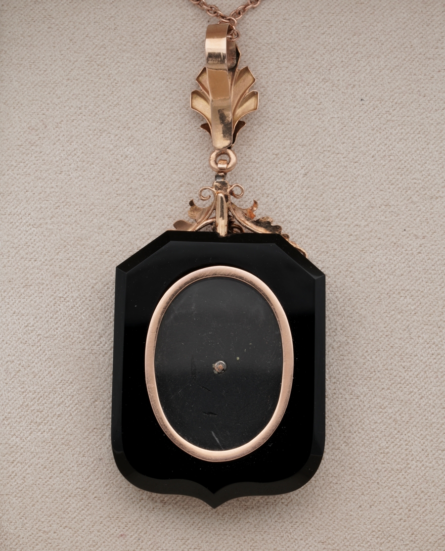 A lovely Victorian example of Black Onyx locket beautifully hand carved into an unusual shield shape
