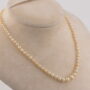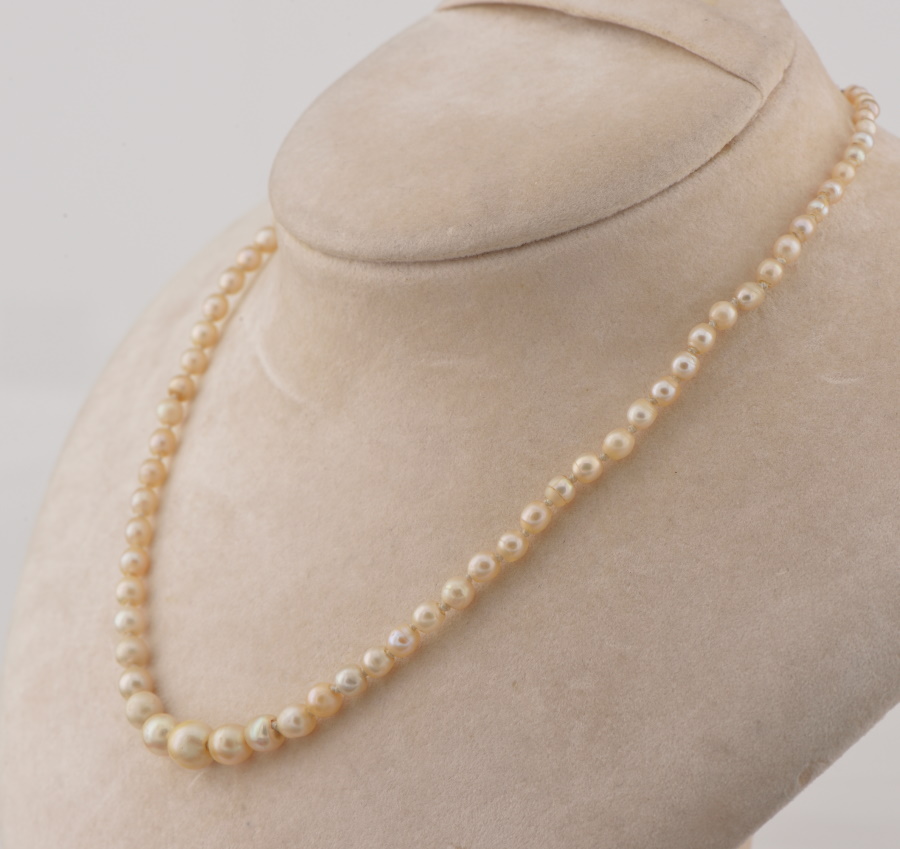 Pearls are graduated in sizes from 7 mm. to 3 mm. average, misshaped some more roundish, varying in colour from white to creamy to some more yellowish, natural blemishes as you would expect on natural pearls