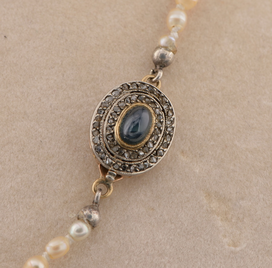 Gems: 76 natural salt water pearls ranging from 7 to 3 mm. (CISGEM report 22141) – 1 oval cabochon cut natural blue sapphire of approx .75 ct – rose cut diamonds accent