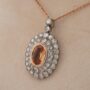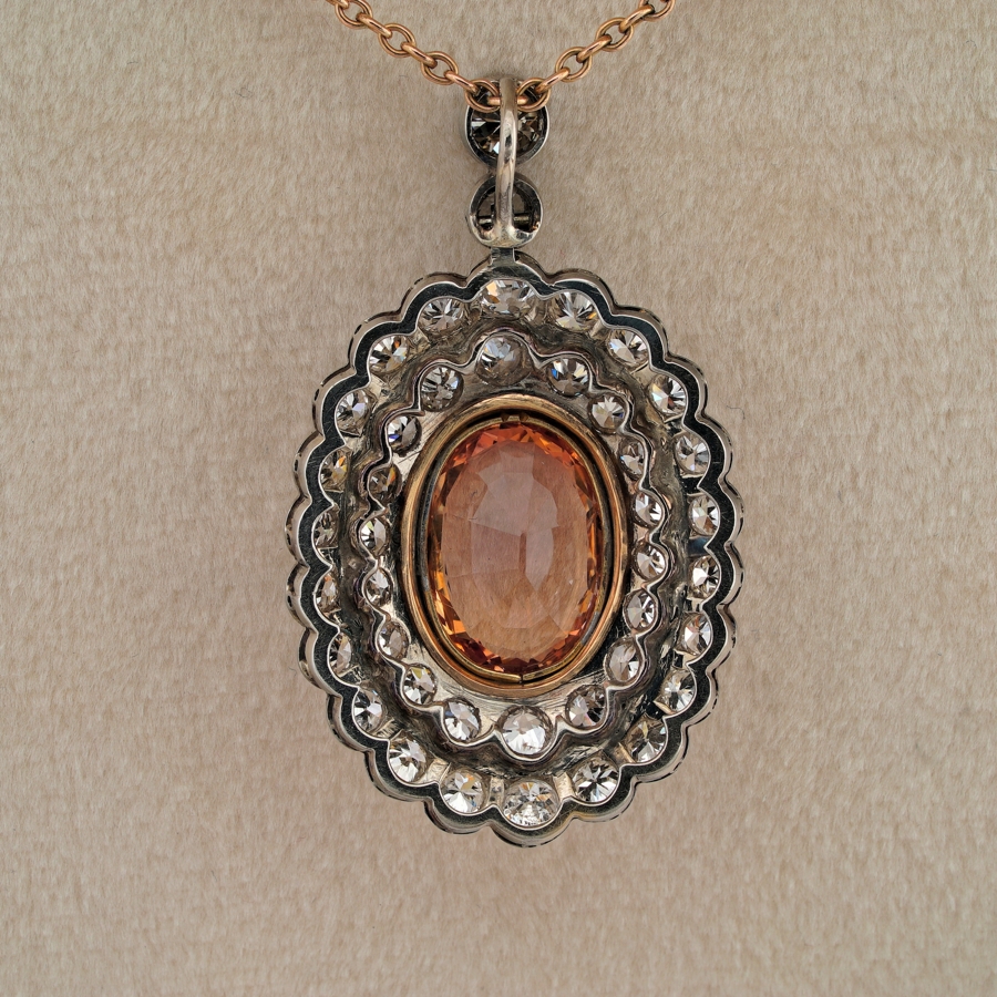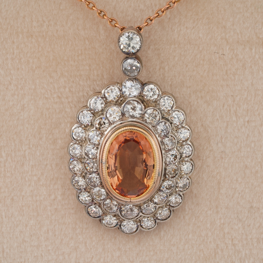 Gems: 1 oval faceted cut natural imperial topaz of approx 4.00 Ct (12.3 x 8.6 mm.)- 42 old European cut diamonds totaling approx 3.60 Ct (G/H/-VVS/VS)