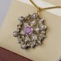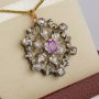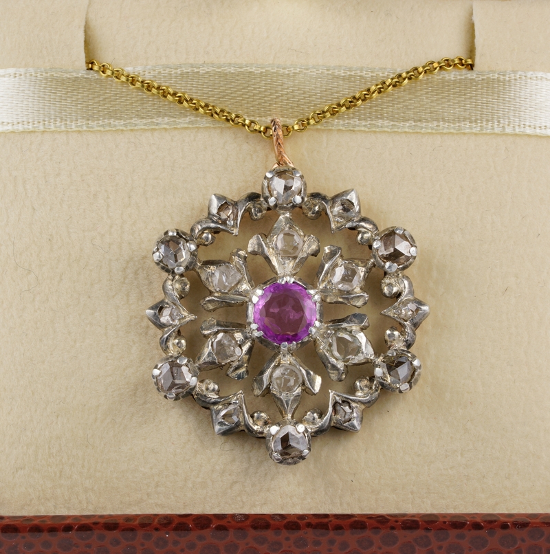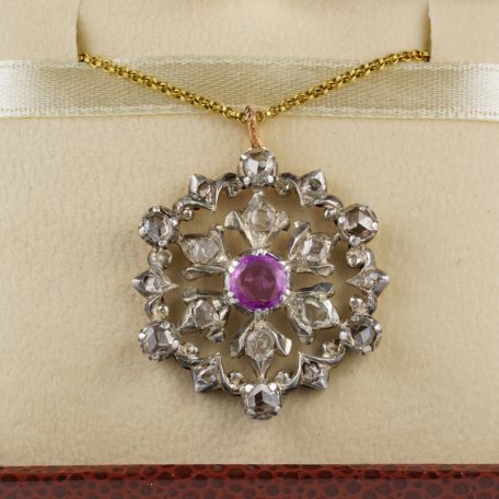 Centre Daisy with scrolled frame is the unique pattern of this pendant, centred by a natural Ruby of 1.25 Ct pleasing pinkish red colour, with surrounding of Rose Cut Diamonds of various sizes adding Sparkle and character to it