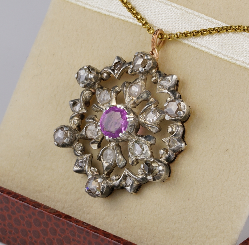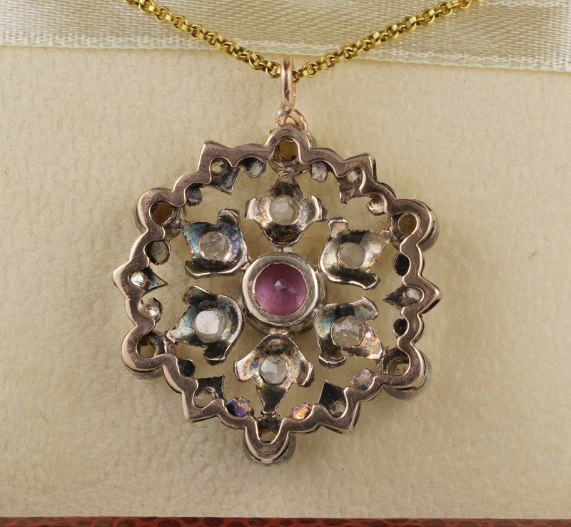 Gems: 1 round faceted cut natural ruby of approx 1.25 Ct – 18 rose cut diamonds totalling approx 2.60 Ct (by spread) not by the real weight