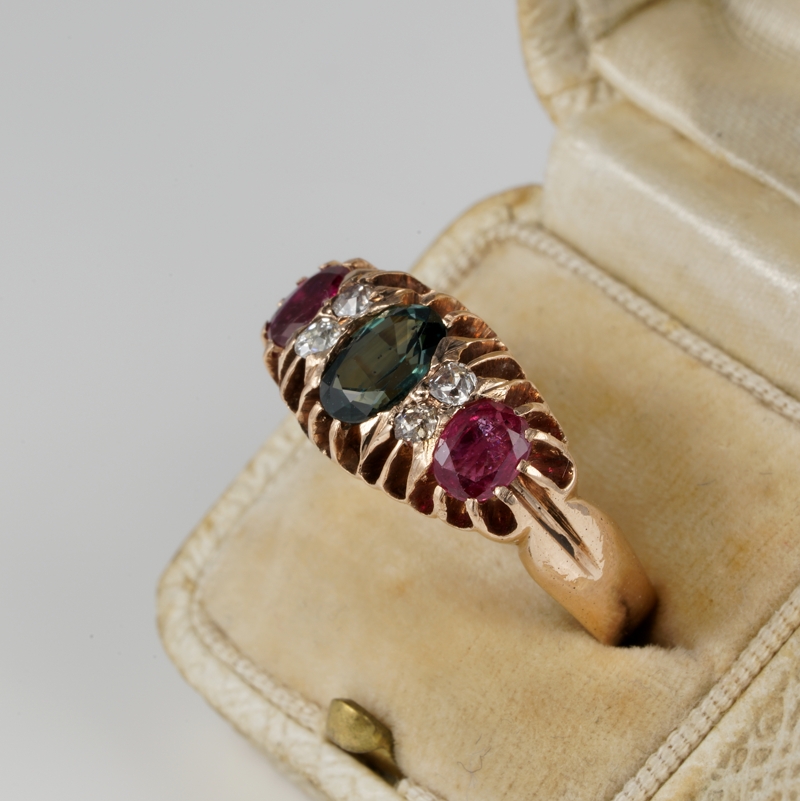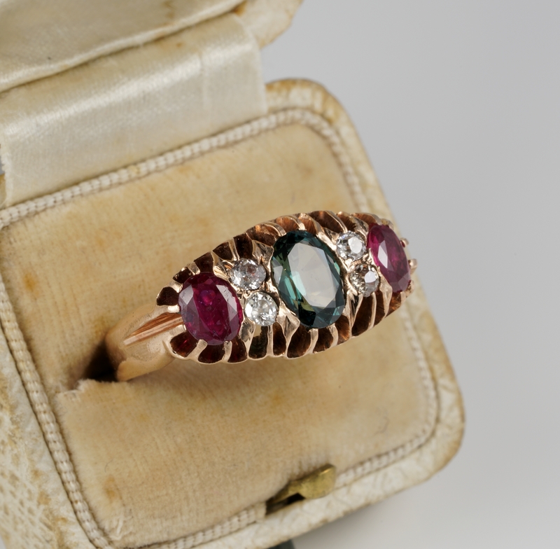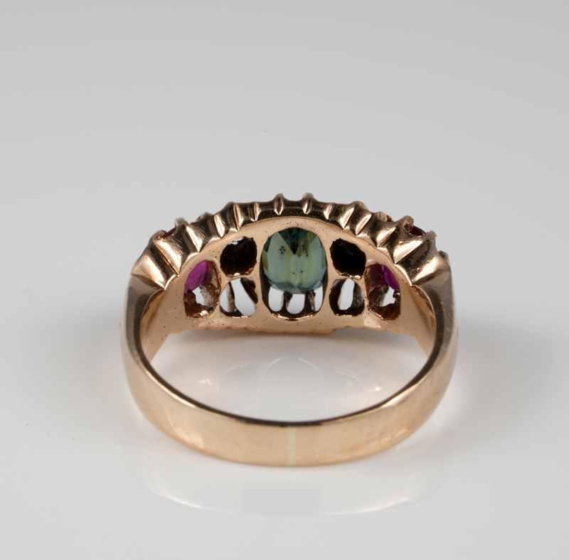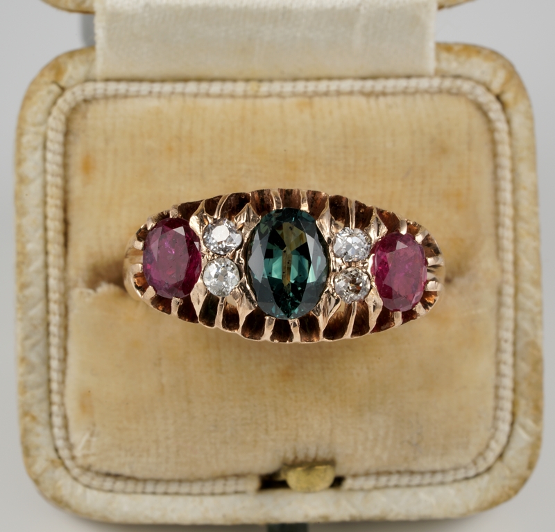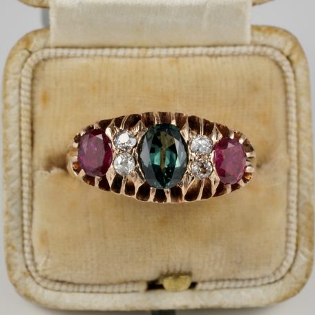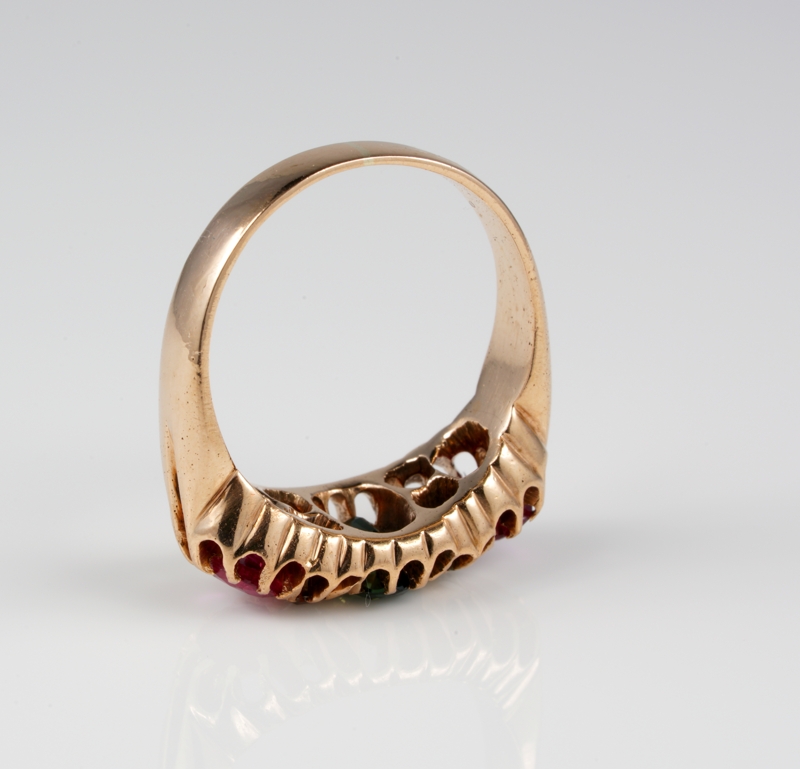This traditional, authentic Victorian ring is 1900 ca, boast gorgeous workmanship of the period, all made of solid 18 Kt pink gold – not marked.