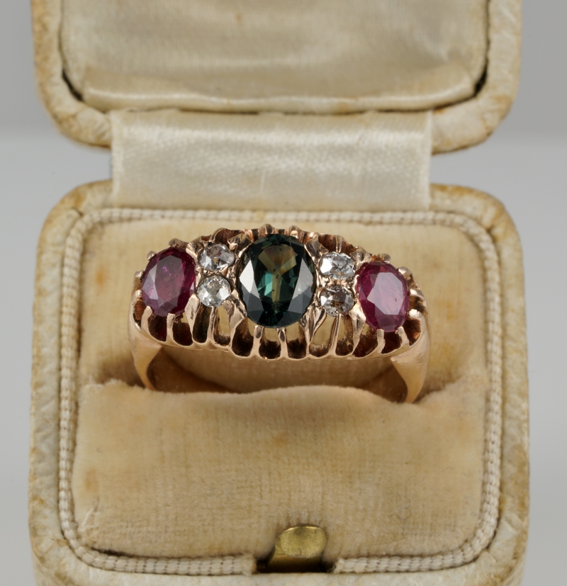The ring has classy boat designed crown, with multi claws setting, forming a charming trilogy version, inter spaced by Diamonds in between the three main stones.