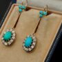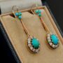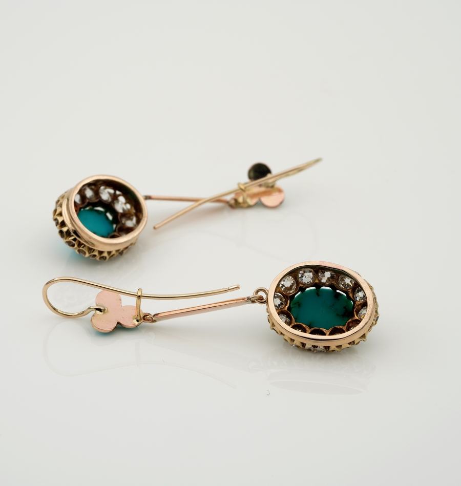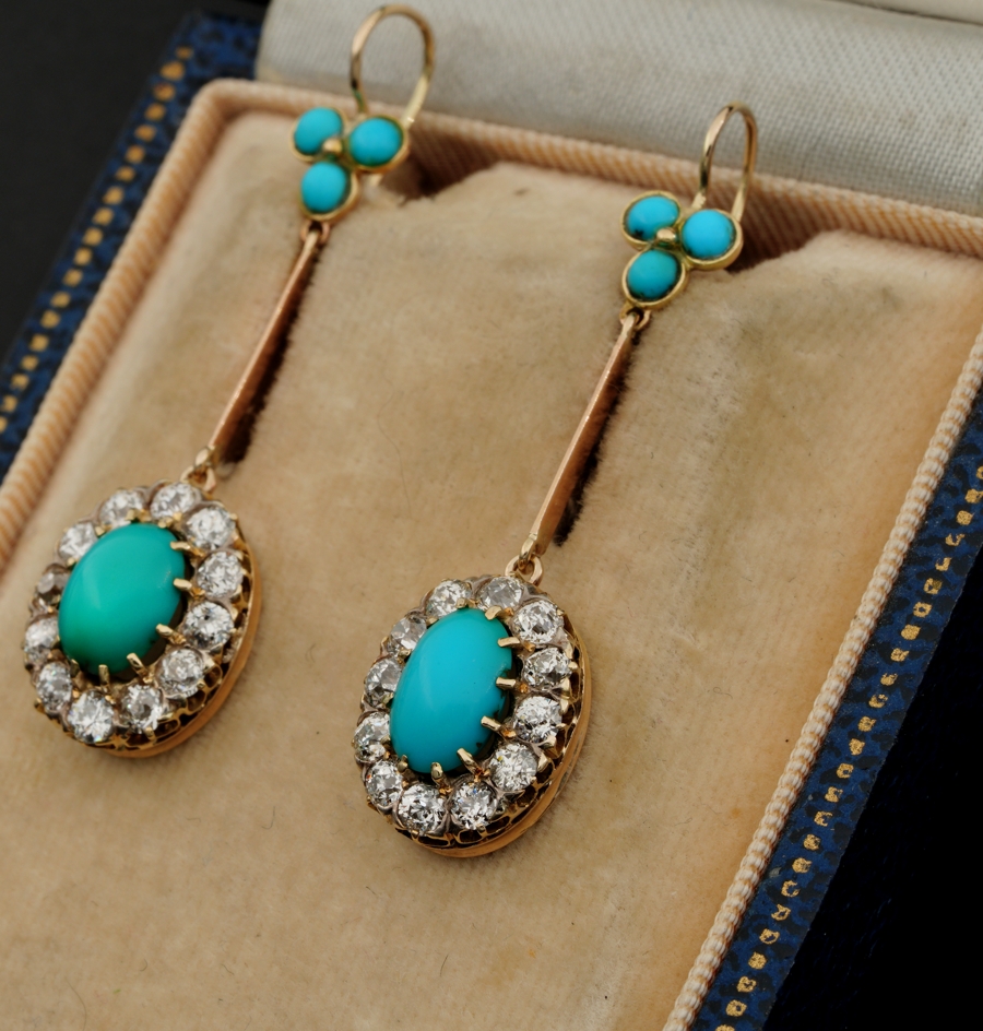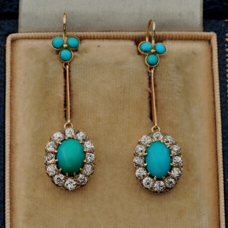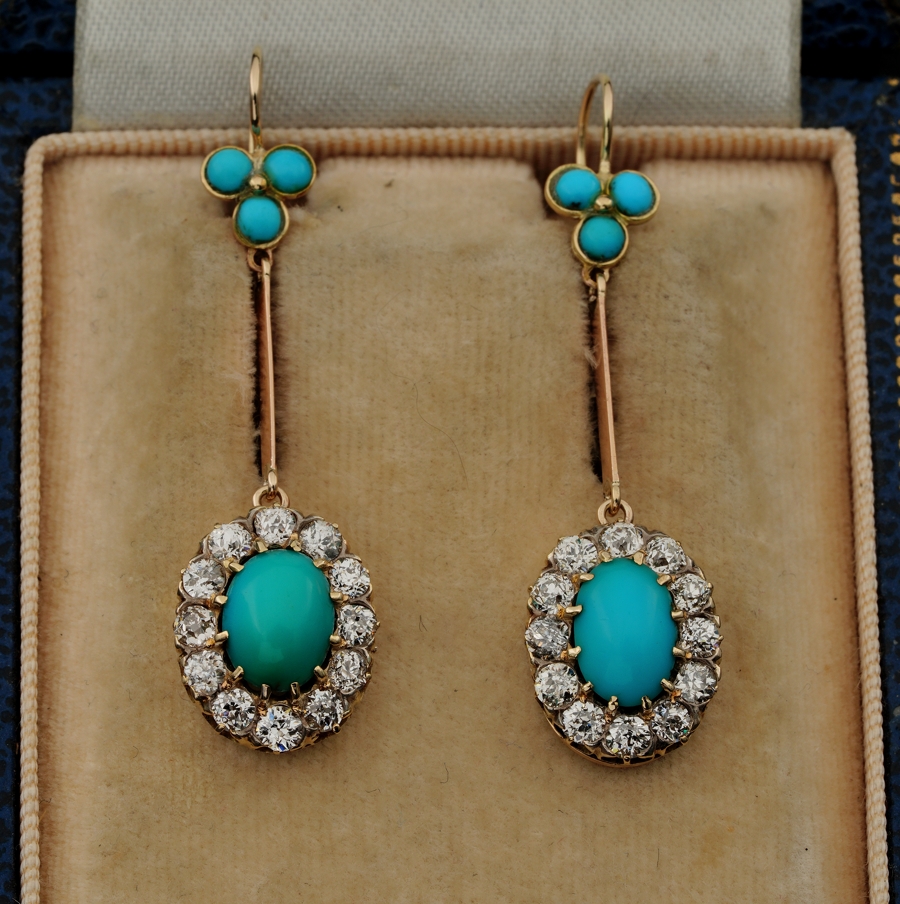 Set with two cabochons of untreated Natural Persian Turquoise of 8x 6 mm. average, surrounded by 2.40 CT of old mine cut Diamonds 24 in number providing the most lovely sparkle catching and reflecting light in their swinging movement ā clusters are 15 mm. x 12 mm. with 44 mm total length